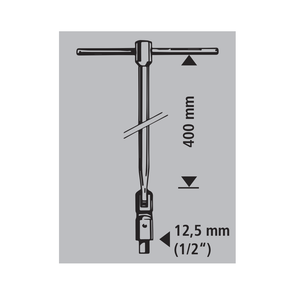 Ez a 400 mm hosszú, 1/2" T-fogantyús hosszabbító szár ideális eszköz anyák és hatlapfejű csavarok kézzel történő becsavarásához.