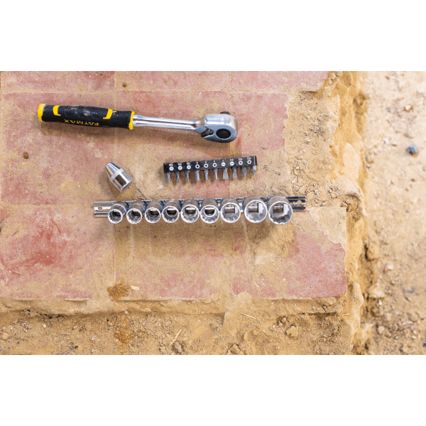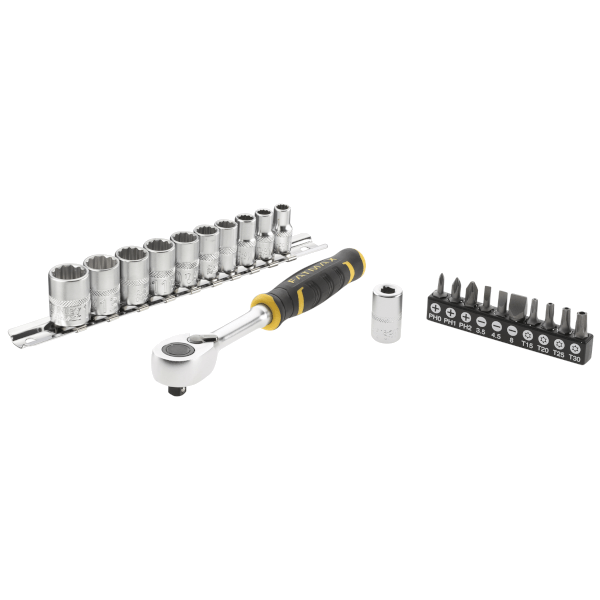 Stanley Fatmax 1/4 " dugókulcs szett, 3 fokonkénti fogazással (FMMT82679-0), hajtókar 3 fokonkénti fogazással, szatén króm dugókulcsok 12 pontos profil, 22 db-os 1/4. Szett tartalma: 1x hajtókar (1/4), 10x dugókulcs 5,5 6 7 8 9 10 11 1213 14 mm, 1x bittartó, 10x bit PH0 PH1 -PH2; lapos: 3,5-4,5-8; TT15-TT20-TT25-TT30.