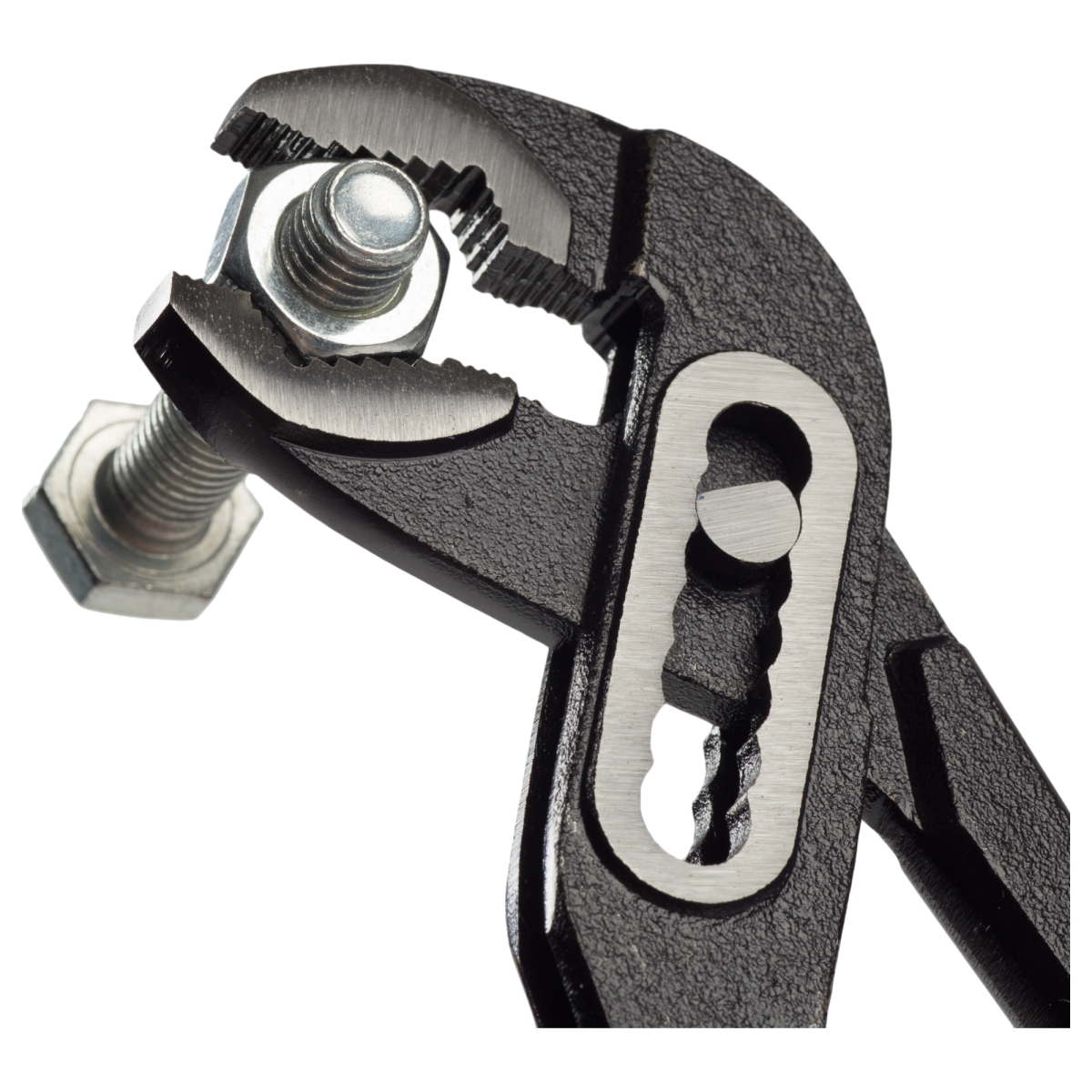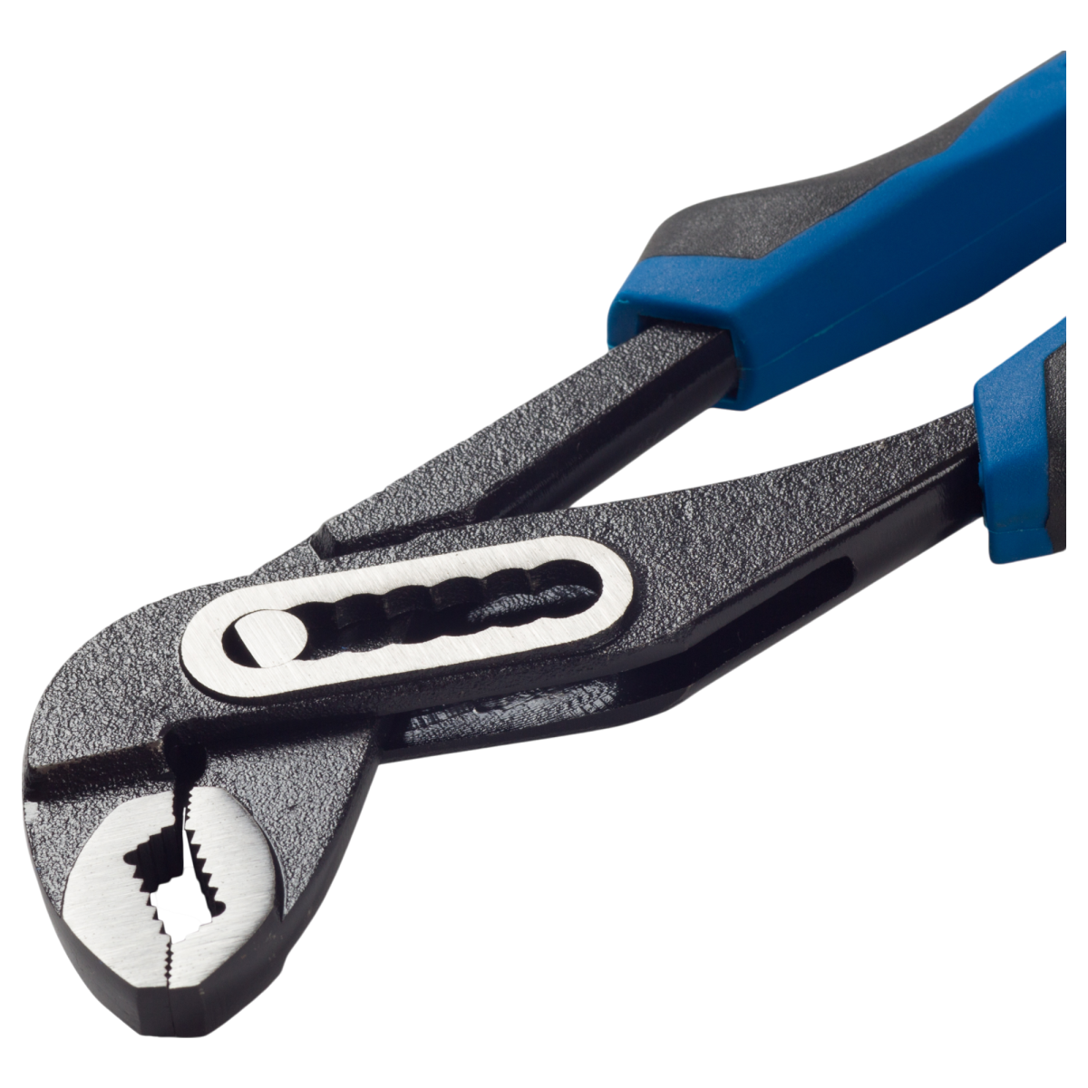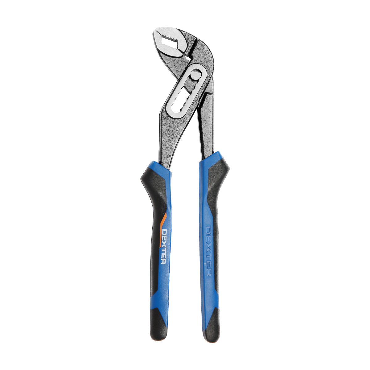 A 250 mm-es Dexter vízpumpa fogó többpontos állítási lehetőséggel (7 pozíció) segít a különböző méretű csövek, anyák és idomok stabil megfogásában. A nem szigetelt, fekete-kék, kétkomponensű markolat kényelmes és biztos fogást biztosít. A csúszócsuklós kialakításnak köszönhetően a pofák nyílása gyorsan és pontosan állítható, így univerzálisan használható szerelési és karbantartási munkák során.
