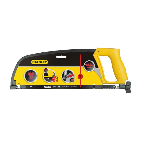 Fémkeret, Hi-speed fűrészlappal. 4 pozícióba állítható fűrészlap. Feszítőerő beállítás. Csavarral erősített nyél. Revolver fazonú nyél.