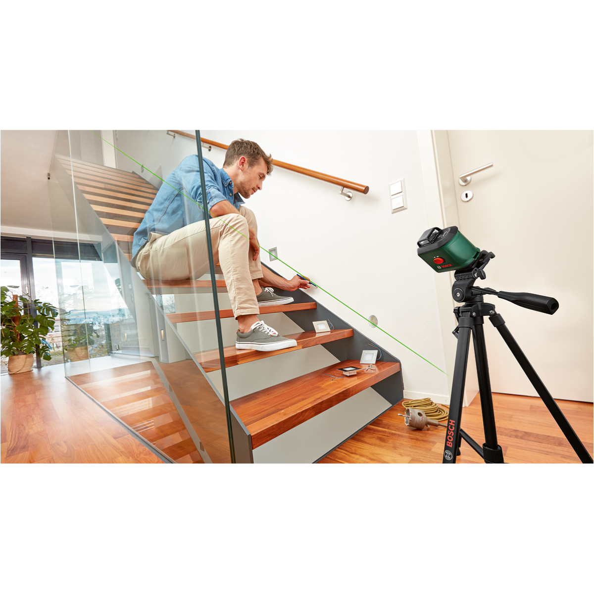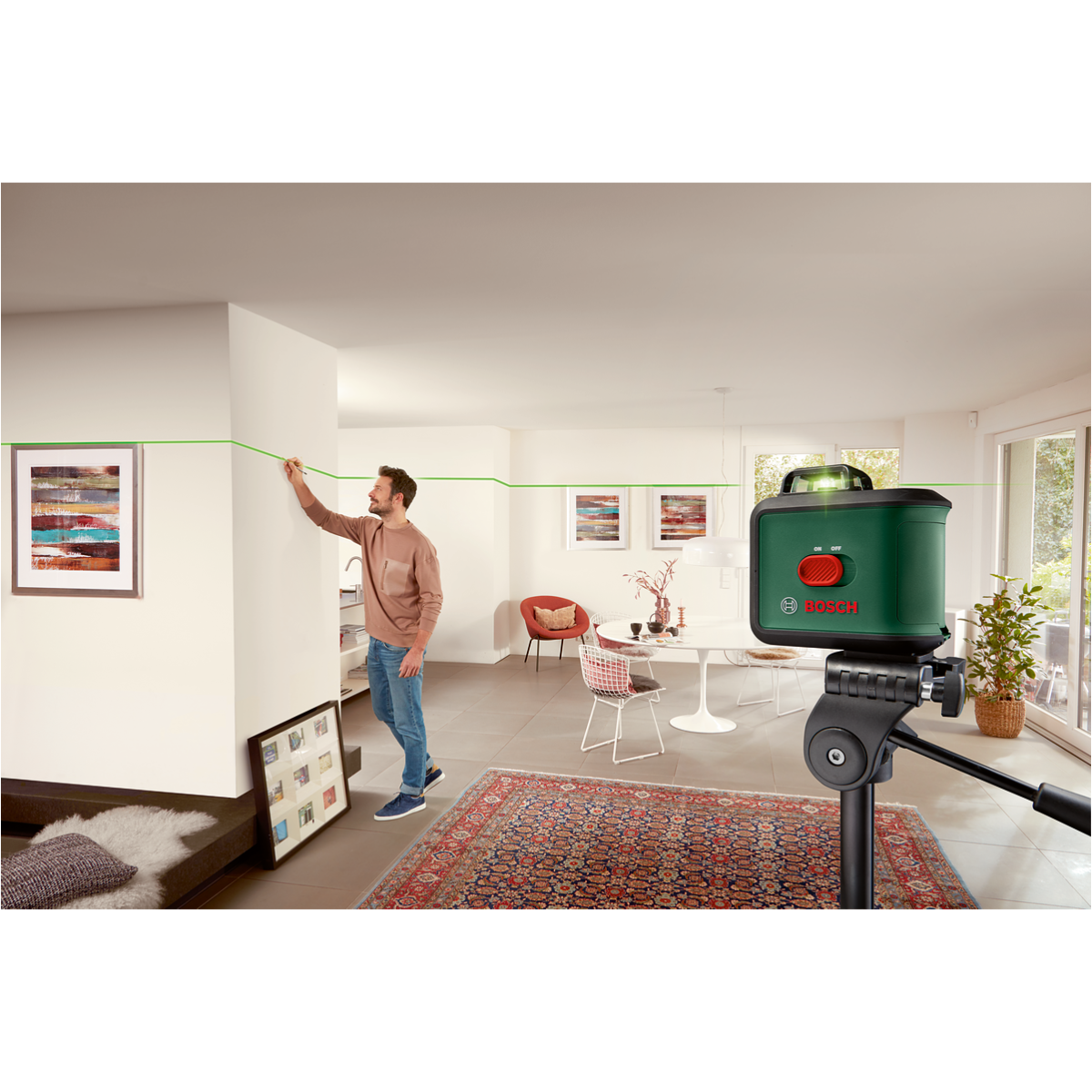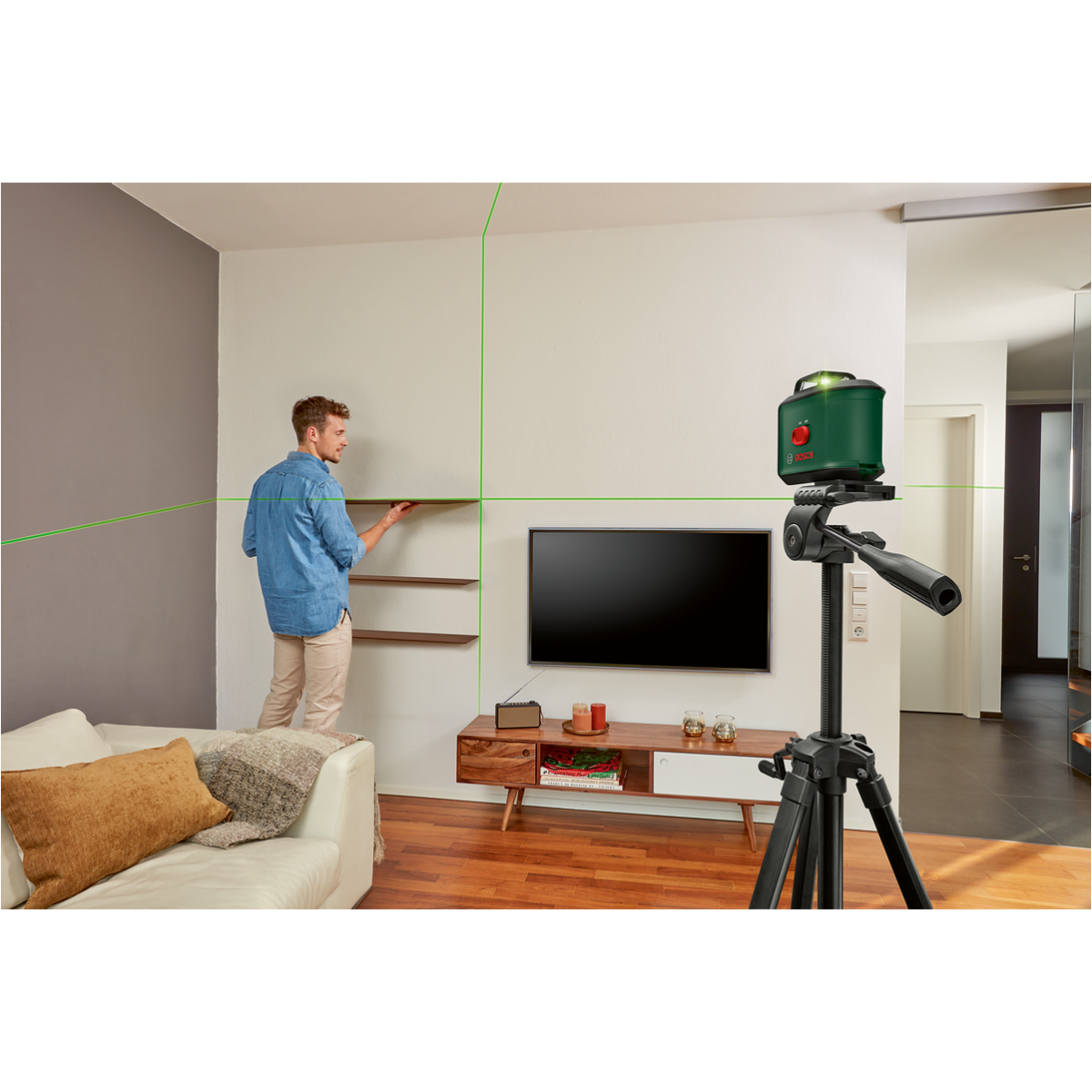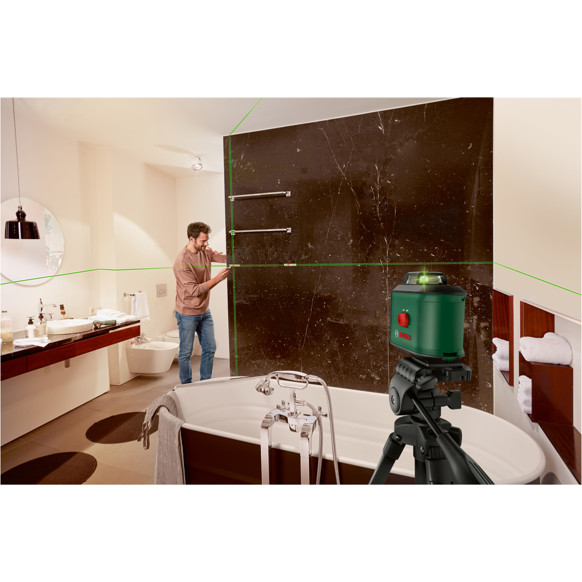 A 360°-os vízszintes és függőleges zöld lézervonalak biztosítják a pontos igazítást a helyiségben – még erős fényviszonyok mellett is.