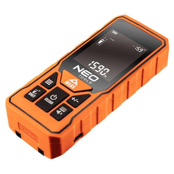 NEO lézeres távolságmérő (ref. szám 75-201) kimagasló minőségű távolság, felület, térfogat mérő készülék. A távolságmérő funkciói lehetővé teszik a mérések összeadását, kivonását, az indirekt mérést (a Pitagorasz számítási móddal), valamint a folyamatos mérést. Ezen túlmenően a készülék automatikus vízmértékkel is rendelkezik, ami lehetővé teszi a készülék beállítási szögének leolvasását. A készülék maximális mérési távolsága 60 m, a mérési pontosság +/- 2 mm. A termék hasznavehető az építőiparban, geodéziában, műszaki projekteknél, valamint a háztartásban. A készülék 0°C és 40°C közötti hőmérséklet tartományban alkalmazható. A CE tanúsítvány igazolja az európai biztonsági normáknak való megfelelést. A NEO márka a professzionális igényeket is kielégíti.