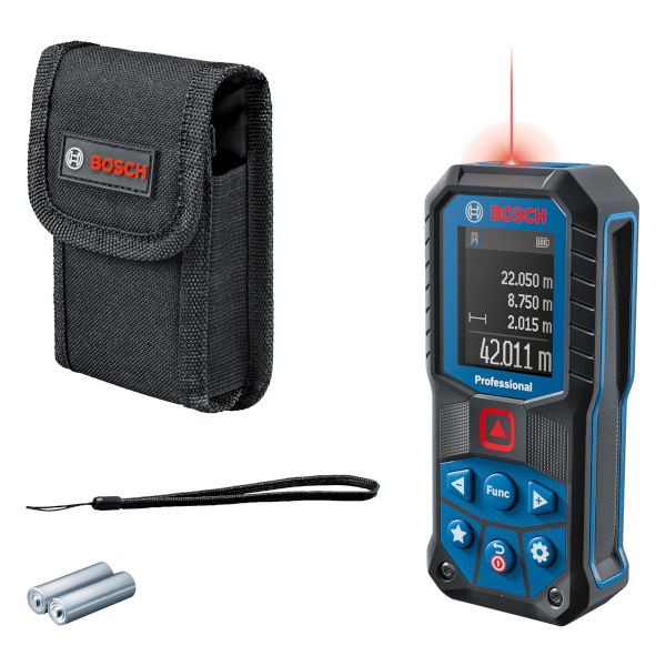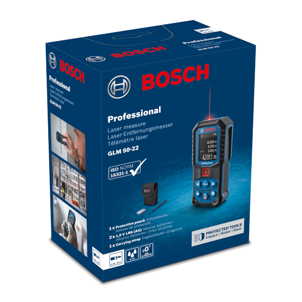 Ideális a durva építkezési területekre az IP65 besorolásnak, az ütést felfogó tokozásnak köszönhetően, és ellenáll a 1,5 m-ről történő lezuhanásnak. Személyre szabható kedvenc gomb a leggyakoribb mérési funkciókhoz és beállításokhoz. Intuitív felhasználói kezelőfelület nagy számokat megjelenítő üzemmóddal, amely jobban olvasható, 30 elérhető nyelv, és új súgó funkcióval rendelkezik. Műszaki adatok: Lézerdióda: 635 nm, < 1 mW, mérési tartomány: 0,05 – 50,00 m, mérési idő, tipikus: < 0,5 s, lézerosztály: 2, mérési pontosság, tipikus.: ± 1,5 mm* (*további, használatfüggő eltérés), mérési idő max.: 4 s, áramellátás: 2 x 1,5-V-LR6 (AA), Kikapcsolási automatika: 5 perc. Mértékegységek: m/cm/mm/ft/inch/ft-inch. Memóriaértékek száma: 10, Por és fröccsenő víz elleni védelem: IP 65. Állványmenet: 1/4". Lézer színe: Piros, Mérési tartomány, max.: 50 m. A termék súlya: kb.: 0,2kg. Termék tartalma: Védőtáska, csuklószíj, 2 x 1,5 V-os LR6 (AA) elem.