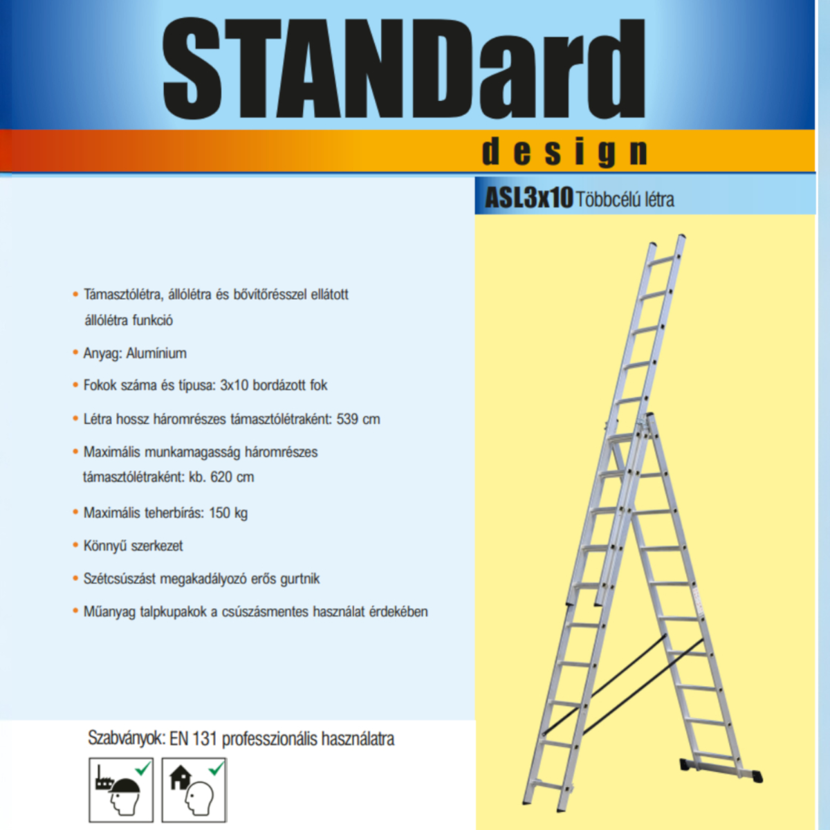 Ez a praktikus, könnyű szerkezetű alumínium létra háromféle használati módot kínál: támasztólétraként, állólétraként, valamint bővítőrésszel ellátott állólétraként is ideális választás. A 3x10 bordázott fok kényelmes és biztonságos fellépést biztosít, a szétcsúszást megakadályozó erős gurtnik, valamint a csúszásmentes műanyag talpkupakok hozzájárulnak a biztonságos munkavégzéshez.