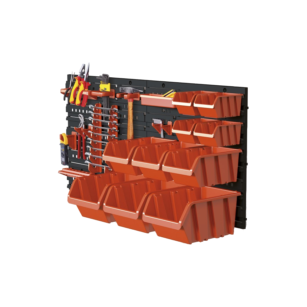 Szerszámpanel tárolóval; a csomag tartalmaz 2 db táblát, 10 db 3 méretű Truck tárolót, és műanyag felfüggesztőket; használatával átláthatóan tárolhatóak a szerszámok, és csavarok egymás mellett.