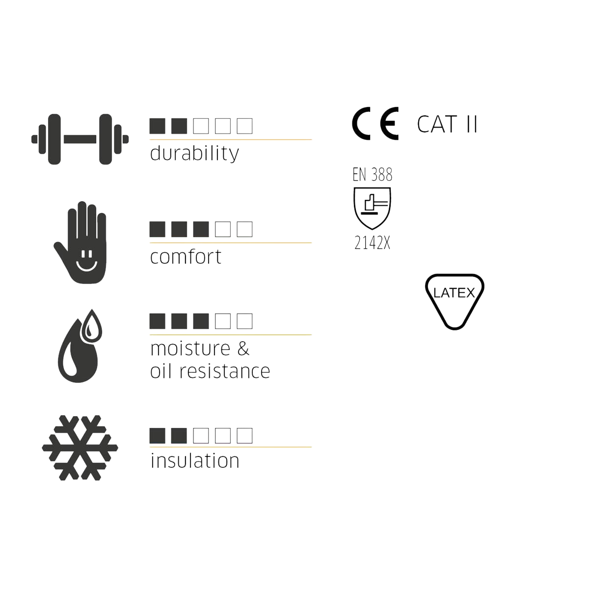 Varrás nélküli, középkötésű, kefélt poliészter alapú kesztyű latex crinkle (gyűrött) tenyérbevonattal. Víz- és olajlepergető felülete jó tapadást ad még sima tárgyakon is – hűvös környezetben is kényelmes és ügyes munka.
