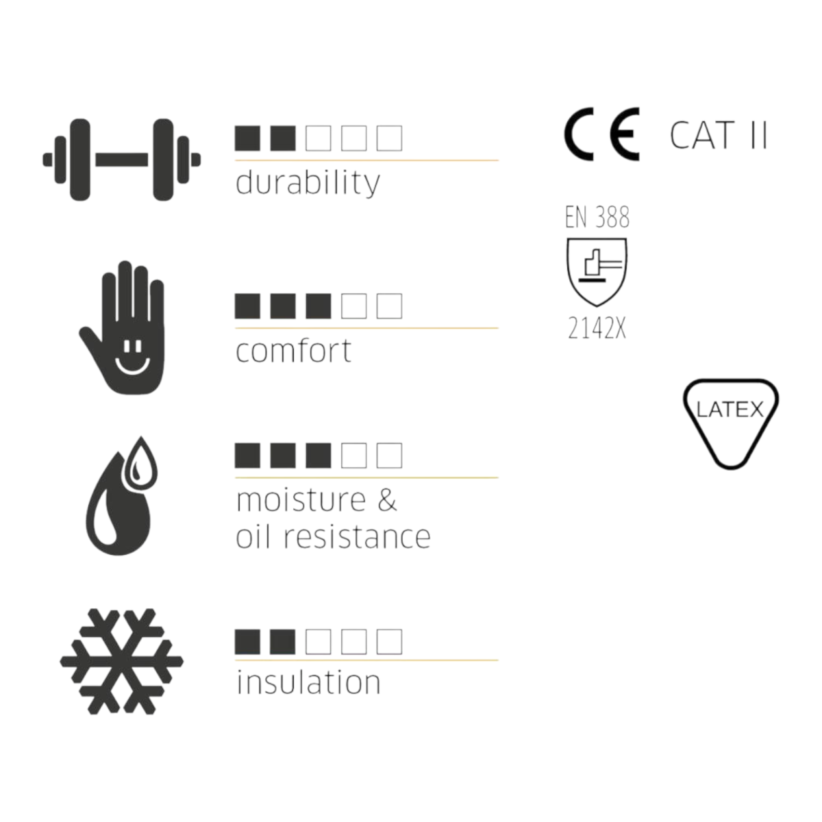 Kényelmes, varrás nélküli téli kesztyű kefélt poliészter alappal és gyűrött (crinkle) latex tenyérbevonattal. Jó kézügyességet és biztos fogást ad nedvesebb, olajos felületeken is, miközben a külső bevonat víz- és olajlepergető.