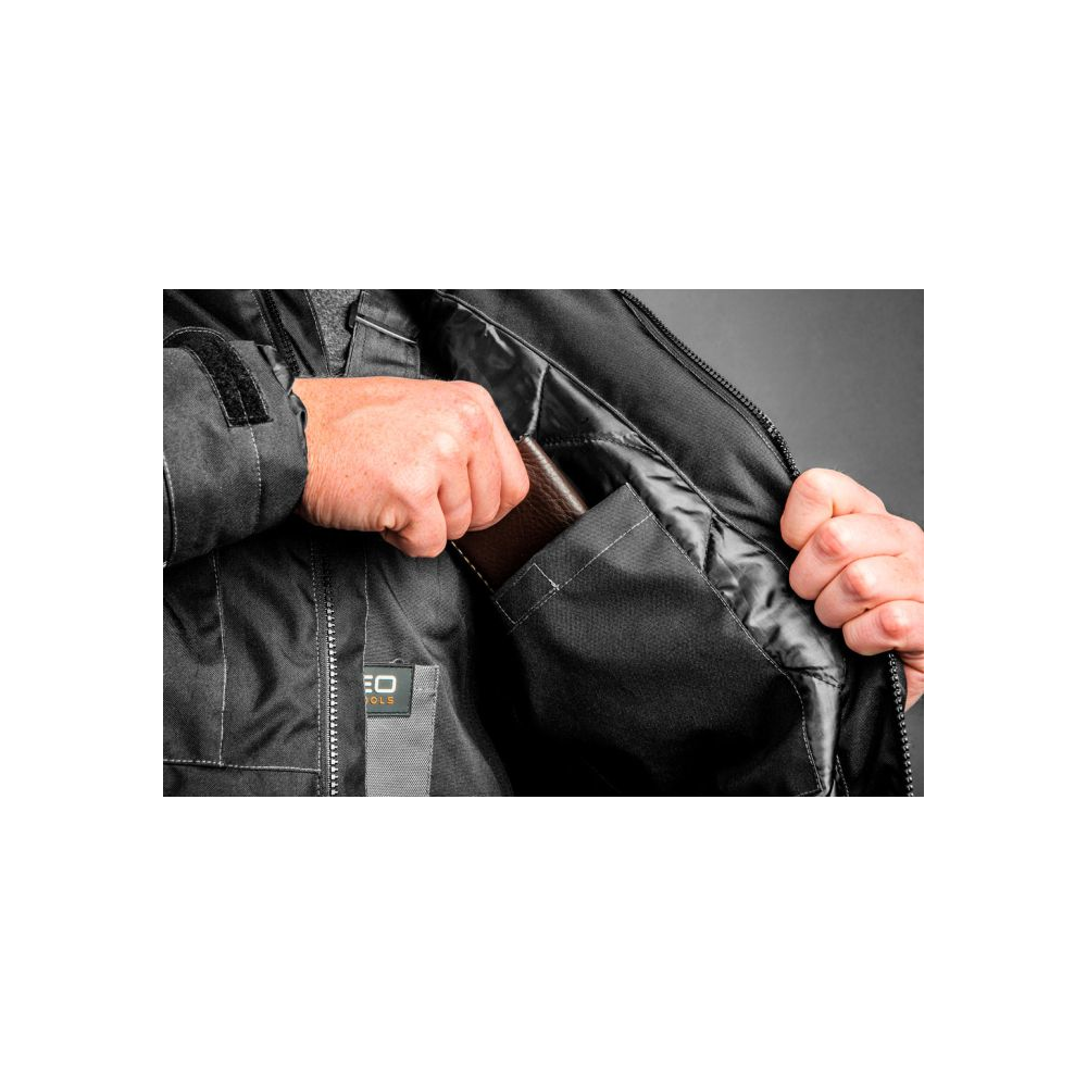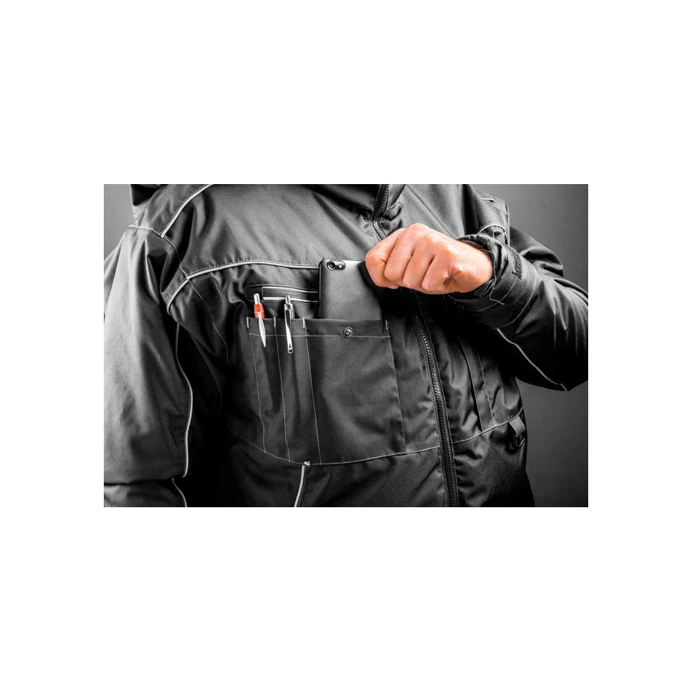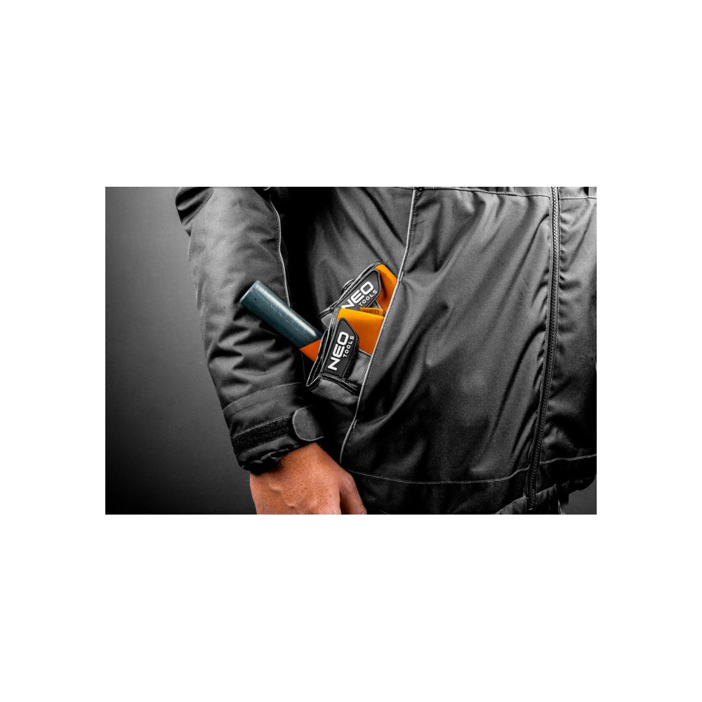 NEO téli munkaruha dzseki vízlepergető és szélálló. Nagyon meleg, de az alkalmazott anyagoknak köszönhetően könnyű és strapabíró. Nem akadályozza vizelője mozgását. Levehető szabályozható csuklyával és magas, a nyakat védő állógallérral. Az ujjak szabályozható rugalmas kézelőkkel, valamint második, a szél és az eső ellen védő belső mandzsettával. A dzseki alsó szegélyvarrásába integrált, szabályozható rugalmas derékkal segíti a meleg megőrzését, maximálisan komfortossá téve a viseletét. Sok hasznos zsebbel, külön, a korábbiakhoz képest nagyobb zsebbel az okostelefonnak. A belső zsebnek és a többfunkciós akasztónak köszönhetően a szükséges dolgokat viselője mindig magánál tarthatja. A fényvisszaverő elemek biztosítják viselője láthatóságát. A termék EN ISO 13688:2013 szabvány szerinti kivitelezése és az európai CE tanúsítványa minőségének garanciája. A NEO márka a professzionális igényeket is kielégíti.