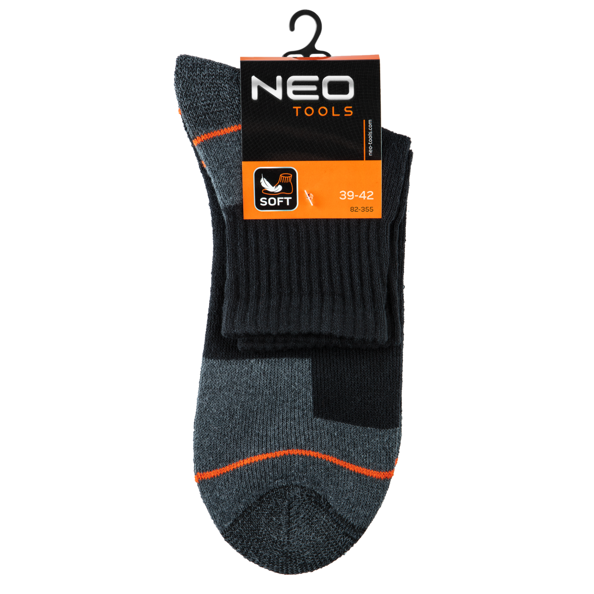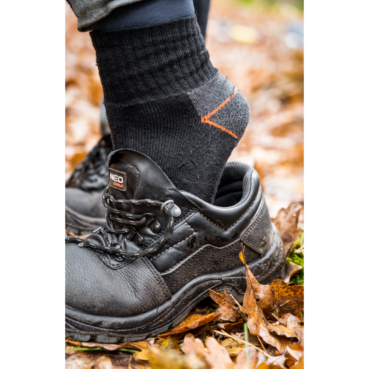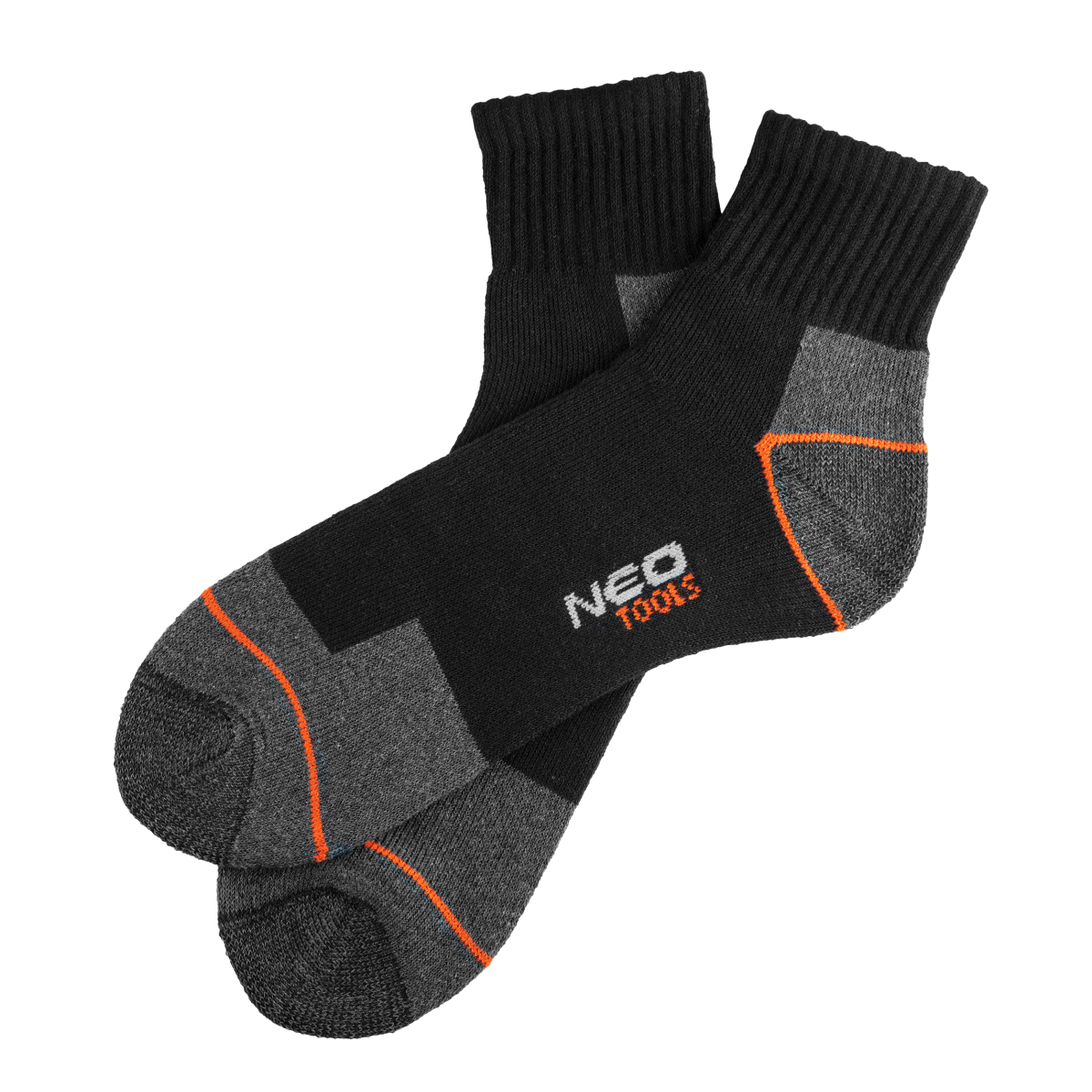 A NEO kiváló minőségű pamutból készült, poliészter, elasztán és akril adalékokkal kiegészített speciális zoknija biztosítja a kényelmet és a higiéniát a munka során. A lábujjakon és a sarkakon megerősítéseket használtak a gyors kopás elleni védelem érdekében. Diszkrét fekete színben, narancssárga-szürke betétekkel.