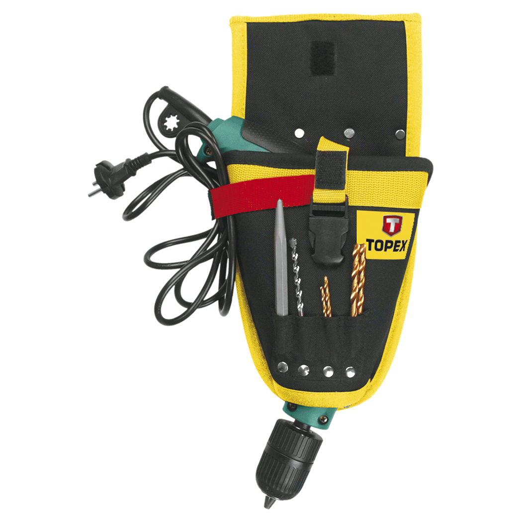 A TOPEX övre rögzíthető elektromos kéziszerszám tok strapabíró műanyagból készül. Van 4 kis zsebe tartozékoknak, pl. biteknek, fúrószáraknak. Csavarozó vagy fúrógép hordásához, csatos szíjjal a szerszám kiesés elleni biztosítására. A TOPEX márka ezermestereknek készül.