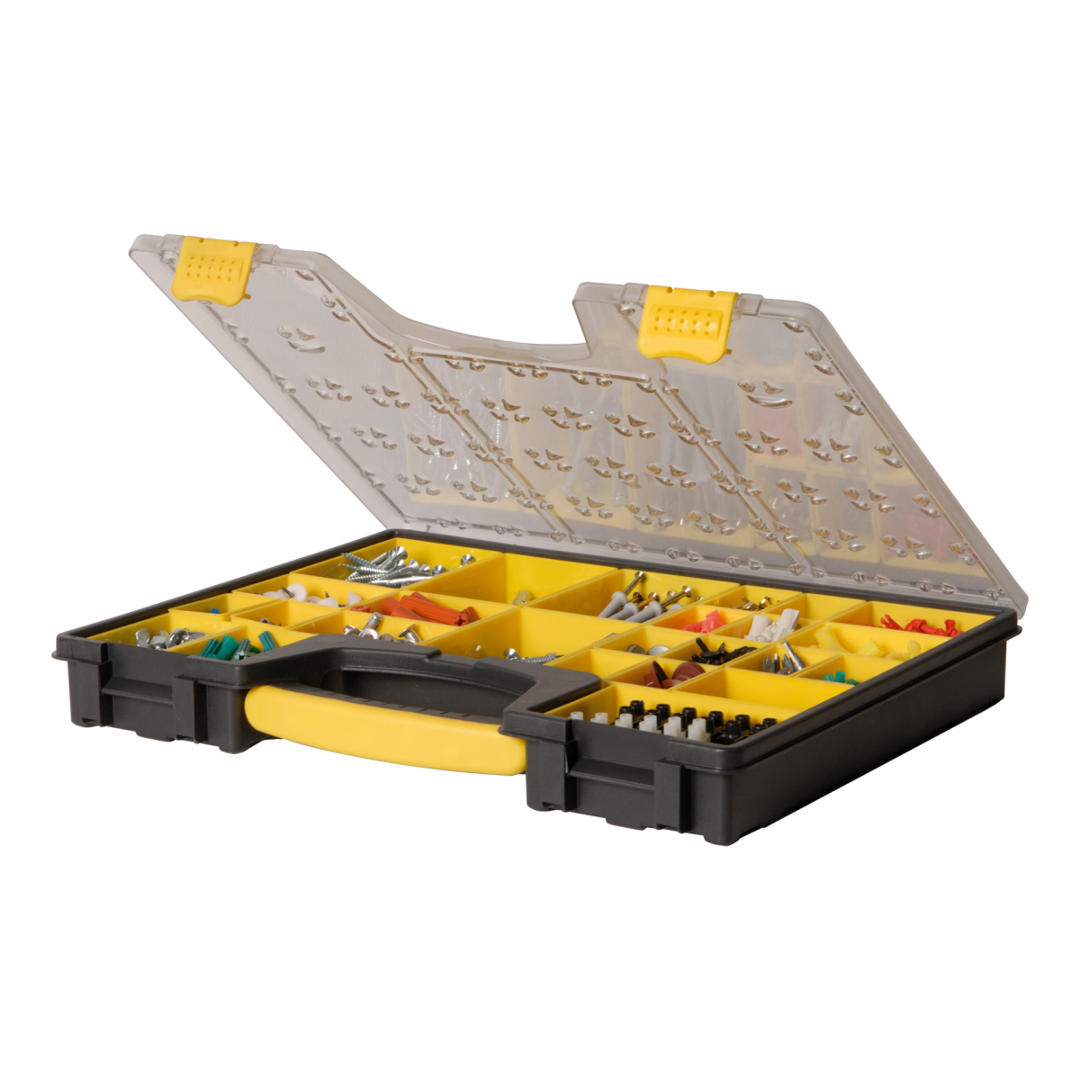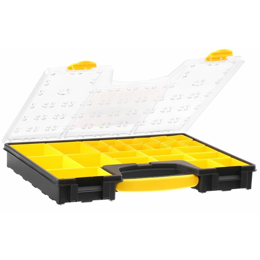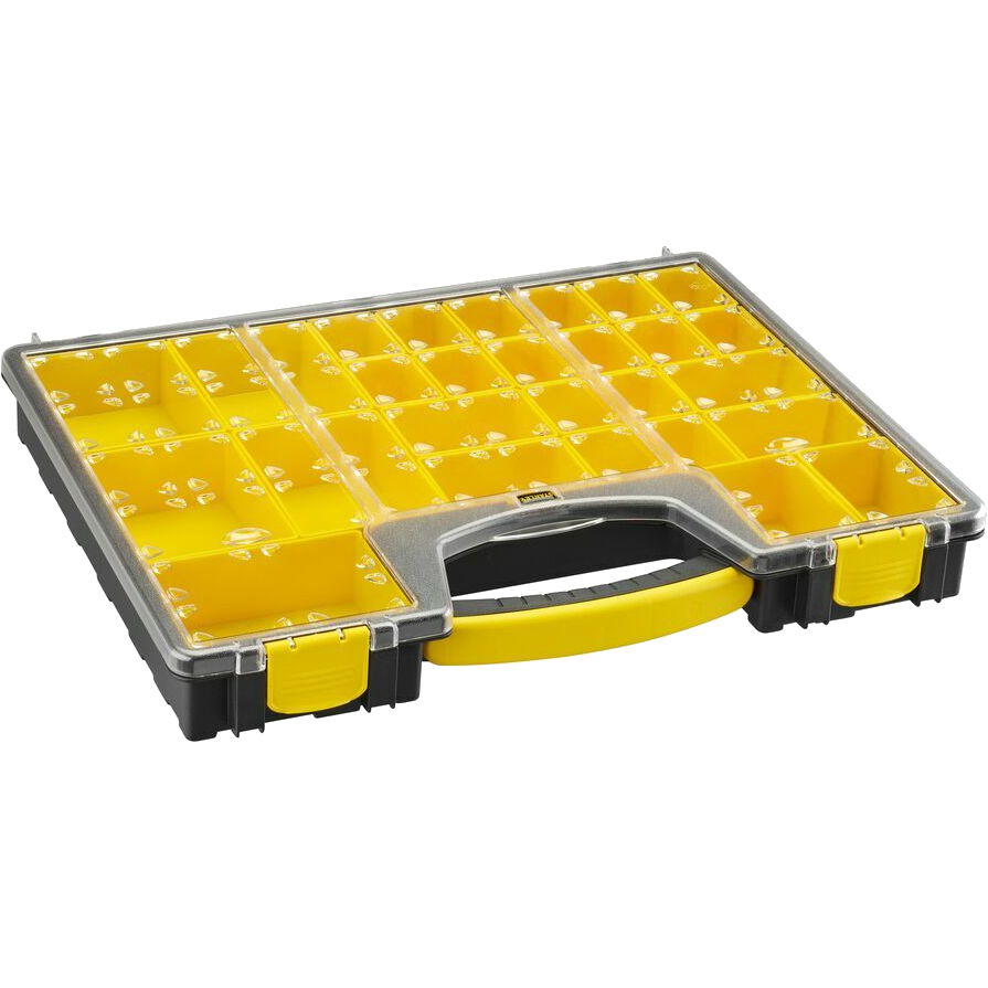 Kivehető 25 egységgel. Zárható fedélrész, mely fixen rögzíti a csavartartó dobozokat. Átlátszó fedélrész. Kényelmes, bimateriális fogantyú. Két különböző mélységméret.