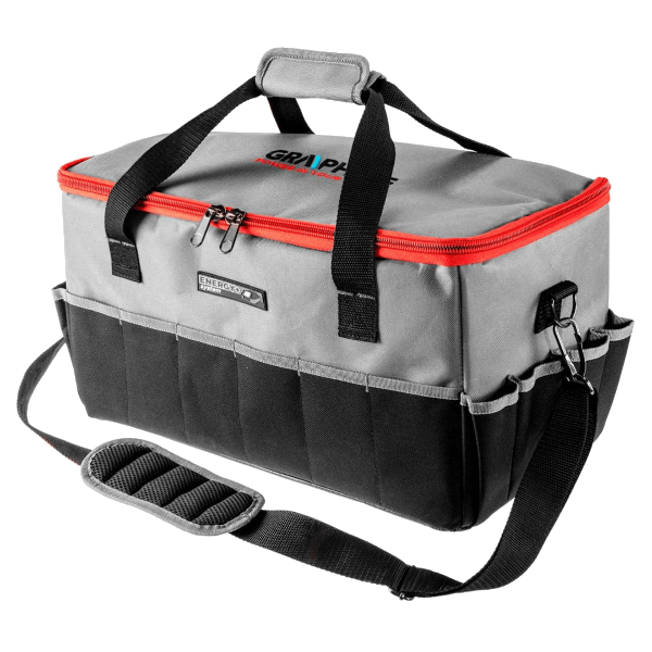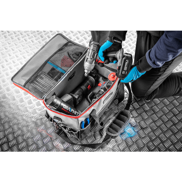 Elektromos szerszámtároló táska, 24 literes. Anyaga poliészter. Nagy szövetsűrűségű, a kopásnak jól ellenálló anyagból készül. A belsõ oldalon laminált poliészter anyag óvja a táska tartalmát a nedvességtõl és a kedvezõtlen idõjárási körülményektõl. A táska 14 külsõ zsebbel, 7 nagyméretű belsõ zsebbel és 14 szerszámtartó akasztóval rendelkezik. Az akasztók lehetõvé teszik a fúró-csavarozó szerszámok (fém akasztó), vagy mérõszalag (textil akasztó) rögzítését. A táska méretei lehetõvé teszik négy elektromos szerszám és tartozékainak (akkumulátor, akkutöltõ, külön kiszerelés) komfortos hordozását. Az akkumulátorok, valamint egyéb alkatrészek további tépõzáras hevederekkel rögzíthetõk, hogy ne mozduljanak el. A táska kényelmes és szolid hordfüllel, valamint szabályozható, fém akasztókkal ellátott vállpánttal is rendelkezik. A táska alja merevített, vízálló, talpakkal, mely a nehéz munkakörülmények között is védi a táska tartalmát. A táska hátfalán kisablak található a perszonalizált cimke, vagy névjegykártya számára.