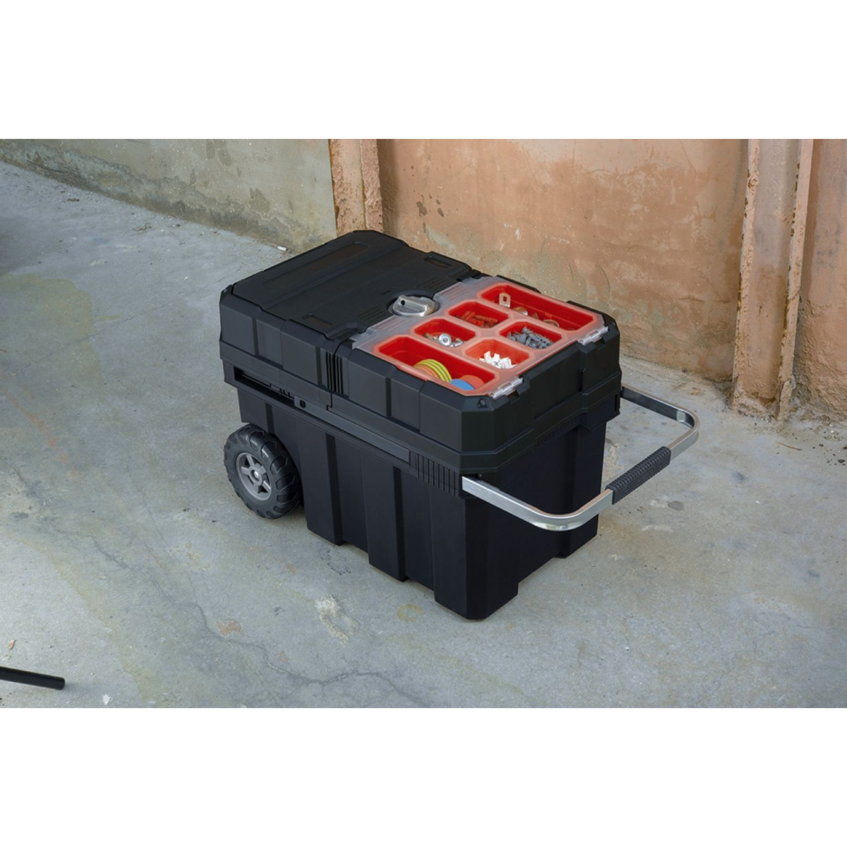 A termék tágas belsővel rendelkezik, mely tartalma tökéletesen ellenőrizhető az áttetsző fedélnek köszönhetően. A szerszámosládában található szerszámok könnyen kivehetők, ami jelentősen megkönnyíti a benne tárolt apró elemekkel, pl. csavarokkal, anyákkal, szögekkel végzett munkát. A szerszámosláda tartós műanyagból készült, ami biztosítja a termék tartósságát és a mechanikus sérülésekkel szembeni ellenállóképességét. - nehezebb szerszámok tárolására - szétcsúsztatható felső rész - 83x61x38 cm - kerekekkel - oldalsó és teleszkópos fogantyú
