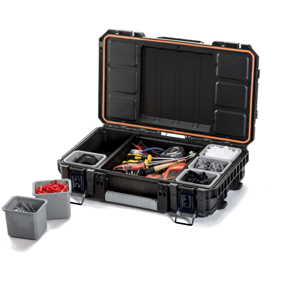 Gear rendszerező 22" Keter. Mérete: 16,5x56,4x35 cm. Professzionális szerszámosláda közepes nagyságú kézi szerszámok tárolására, levehető felső résszel a leggyakrabban használt szerszámok számára. speciális kattanózárral és oldalsó fogantyúval rendelkezik - tartós fémből készült elemek. Aszerszámosláda külön elemként kapható. Beépített tömítéssel a víz és a por bejutásának megakadályozása érdekében. A termék oldalain elhelyezkedő fém kapcsok segítségével több láda egymásra rögzíthető.