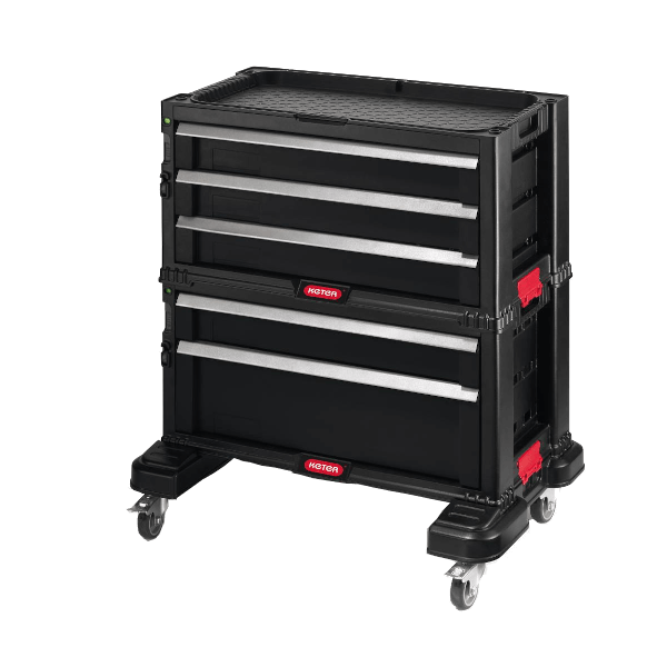 5 fiókos szerszámosláda szett Keter - központi zárral - mély fiókkal, kivehető rendszerezővel - 4db fiók - 16 kivehető rendszerezővel - piros/szürke/fekete - 56,2x28,9x50,2 cm Dekoráció nélkül!