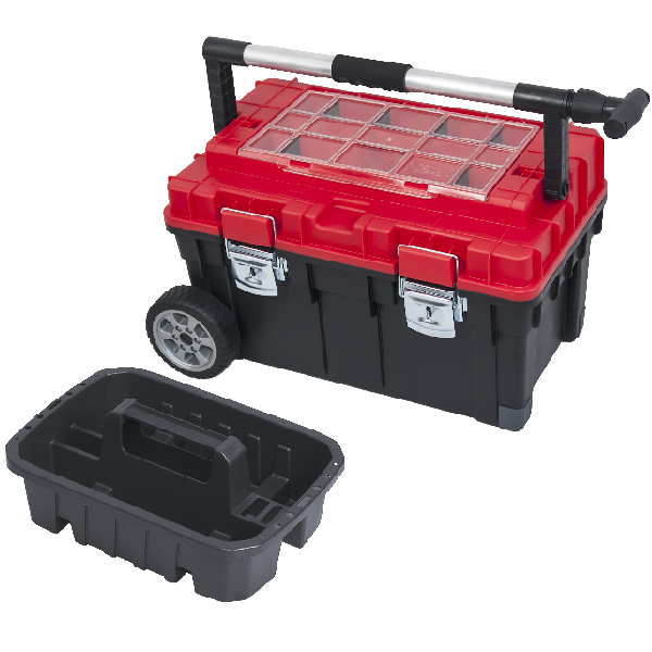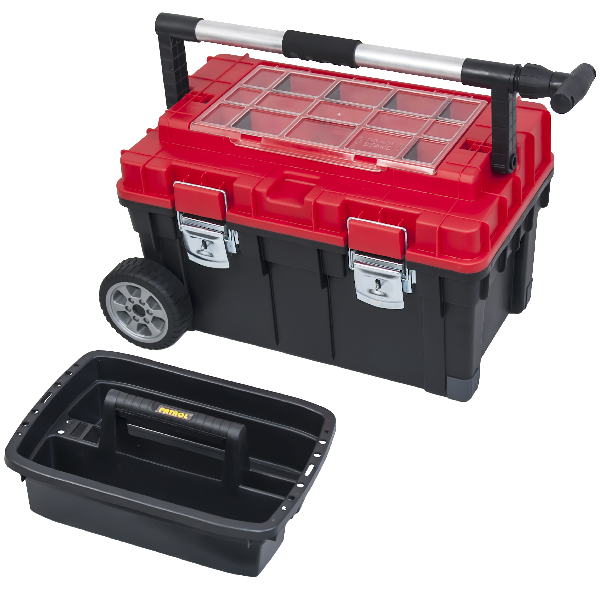 "Patrol" húzható szerszámosláda - polikarbonát fedél, alu hordozó, fém csattok - szabadon osztható szortimenterek a fedélben - kihúzható karral - gumírozott kerekekkel - 63x40x35,5 cm