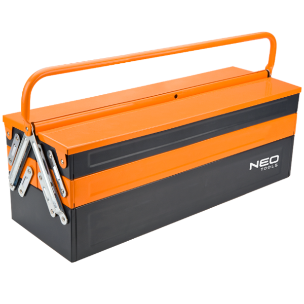 NEO többszintes fém szerszámosláda. Tartós, a ládának nagy ellenálló képességet biztosító acéllemezből készül. A praktikus rekeszek megkönnyítik a szerszámok tárolását. A láda kinyitás után két oldalra szétcsúszik, megkönnyítve a hozzáférést a szerszámokhoz. A nagy fogantyú lehetővé teszi a láda kényelmes hordozását. A NEO márka a professzionális igényeket is kielégíti.