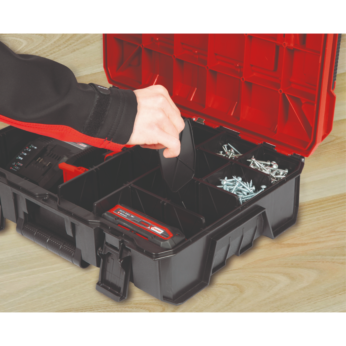 Az Einhell rekesz készlet praktikus kiegészítője az Einhell E-Case rendszernek, amely segít maximálisan kihasználni a rendszerkofferek belső tereit.