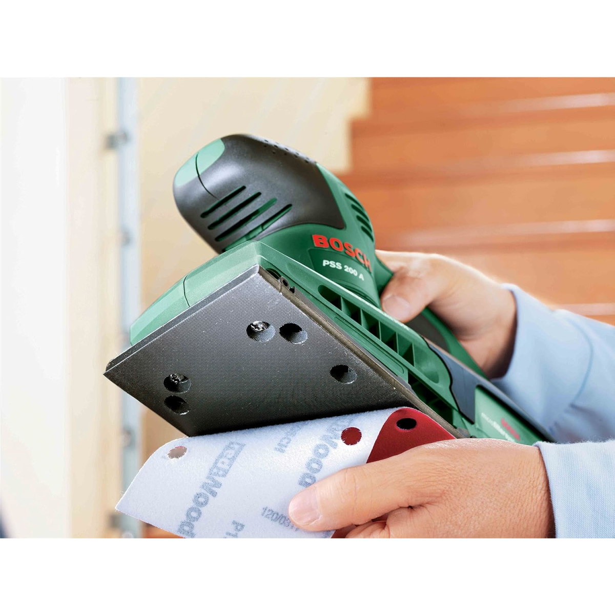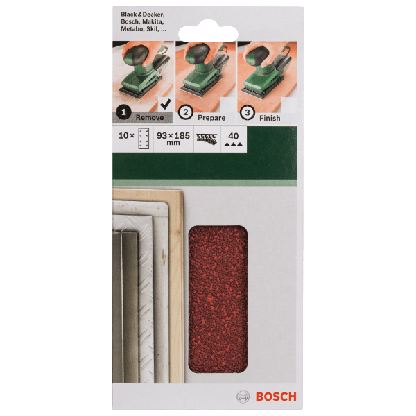 Bosch csiszolólap készlet rezgőcsiszolókhoz, 10 db. Különböző anyagok sima felületének gyors és finom csiszolására alkalmas. Tépőzáras rögzítés a gyors csiszolólap cseréhez. A porelszívó nyílások biztosítják, hogy használat közben ne tömődjön el a csiszolólap. Méret: 93 mm x 185 mm. Szemcseméret: 40. Lyukak száma: 8.