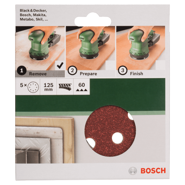 Bosch csiszolópapír készlet excentercsiszolókhoz, 5 db. Optimális 125 mm átmérőjű csiszolólap bármely alkalmazáshoz. Minőségi alapanyagból készült a különböző anyagok és felületek csiszolásához. Tépőzáras rögzítési rendszerrel a biztos tartásért és a gyors lapcsere érdekében. 8 db porelszívó nyílás akadályozza meg a csiszolópapír eltömődését. A legtöbb excentercsiszolóhoz használható. Átmérő: 125 mm. Szemcseméret: 60.