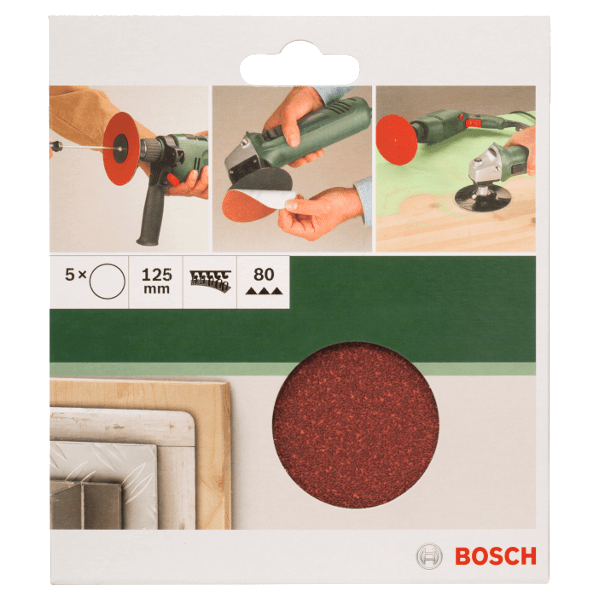 Bosch csiszolólap készlet sarokcsiszolókhoz és fúrógépekhez, 5 db. Műgyanta kötésű alumínium-oxid szemcsék és V8 vulkánfíber a nagy anyageltávolítási sebesség és a hosszú élettartam érdekében. Tépőzáras rögzítési rendszerrel a biztos tartásért és a gyors lapcsere érdekében. Tépőzáras rögzítésű alátéttányérokkal használható. Átmérő: 125 mm. Szemcsézet: 80.