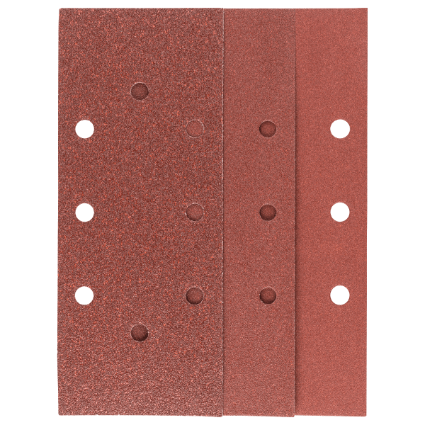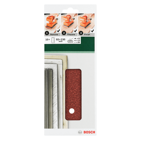 Bosch csiszolólap készlet rezgőcsiszolókhoz, 10 db. Különböző anyagok sima felületének gyors és finom csiszolására alkalmas. Tépőzáras rögzítés a gyors csiszolólap cseréhez. A porelszívó nyílások biztosítják, hogy használat közben ne tömődjön el a csiszolólap. Méret: 93 mm x 230 mm. Lyukak száma: 8. A készlet tartalma: 4 db G60. 4 db G120, 2 db G180.