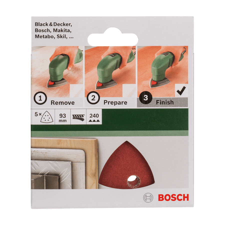 Bosch csiszolólap készlet deltacsiszolókhoz, 5 db. Felületcsiszoláshoz és felületi hibák lecsiszolásához, illetve előcsiszoláshoz pl. durva, egyenletlen gerendákon és farostlemezeken. Segítségével a 90°-nál szűkebb sarkokban is tiszta és precíz csiszolás lehetséges. A tépőzáras rögzítők biztonságosan tartják a lapokat, és segítik a gyors cserét. A legtöbb hagyományos márkájú géphez használható. Méret: 93 mm. Szemcsézet: 240.