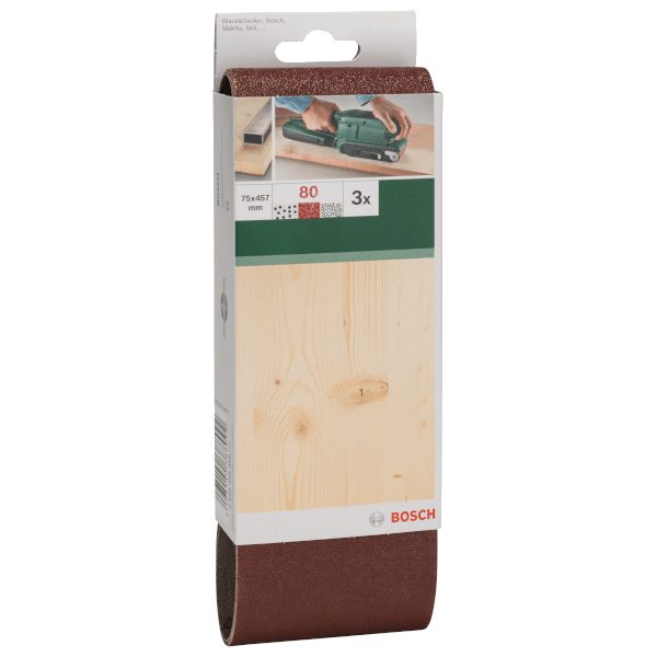 Bosch csiszolószalag. Nagy teljesítményű abrazív alapanyagból készült, amely hozzájárul a nagy anyageltávolítási sebességhez nagy felületeken. Rendkívül robusztus és tartós csiszolószalag kiváló minőségű szalagvarratokkal a hosszú élettartamért. Az antisztatikus szerkezetnek köszönhetően a szalag futása rendkívül pontos és tiszta, ami kiváló felületminőséget és pormentes csiszolószalagokat, munkadarabokat és szerszámgépeket eredményez. Mérete: 75 mm x 457 mm. Szemcseméret: 80.