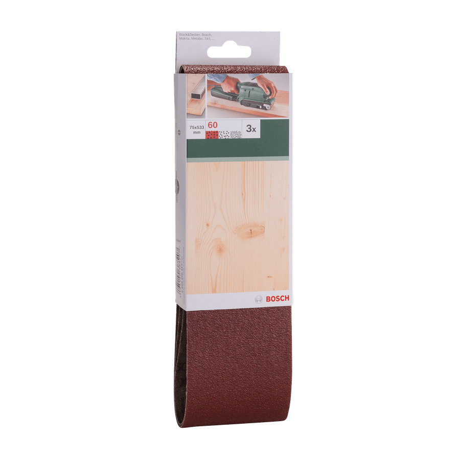 Bosch csiszolószalag. Nagy teljesítményű abrazív alapanyagból készült, amely hozzájárul a nagy anyageltávolítási sebességhez nagy felületeken. Rendkívül robusztus és tartós csiszolószalag kiváló minőségű szalagvarratokkal a hosszú élettartamért. Az antisztatikus szerkezetnek köszönhetően a szalag futása rendkívül pontos és tiszta, ami kiváló felületminőséget és pormentes csiszolószalagokat, munkadarabokat és szerszámgépeket eredményez. Mérete: 75 mm x 533 mm. Szemcseméret: 60.
