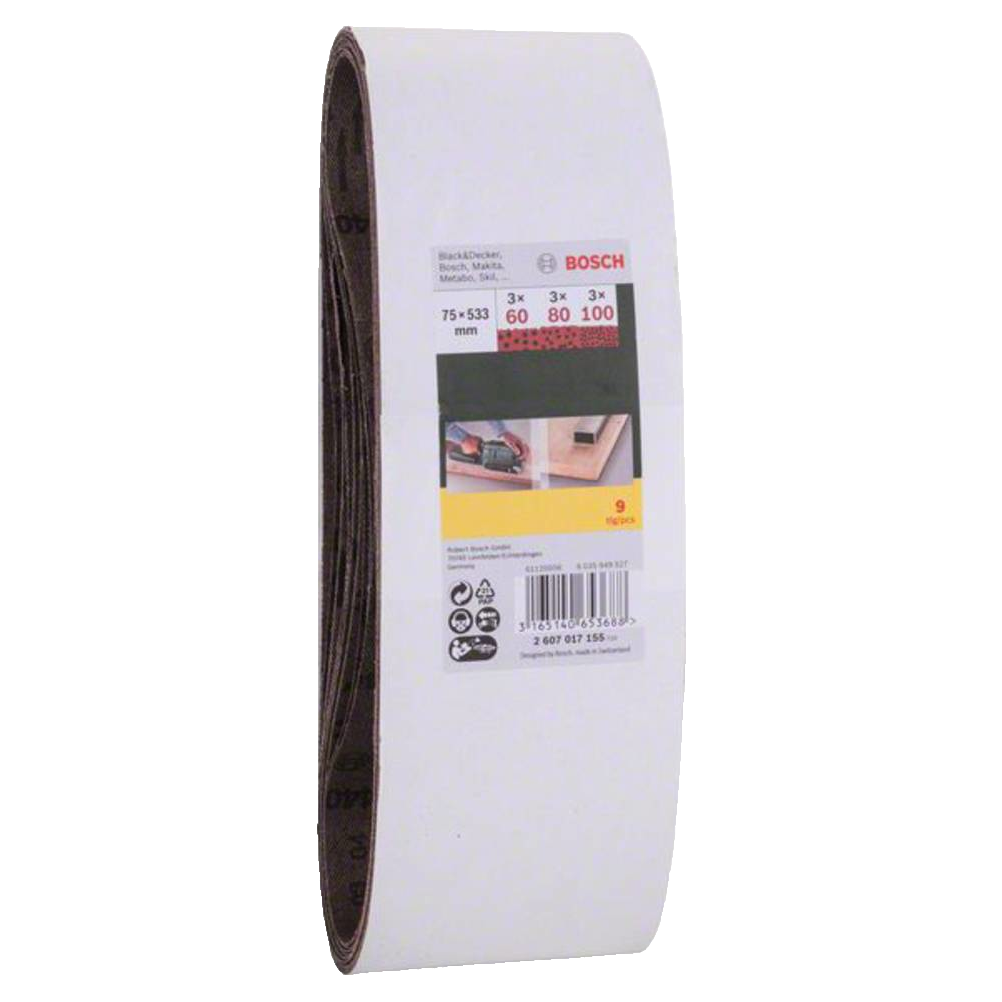 Bosch 9 darabos csiszolószalag készlet szalagcsiszolókhoz, 75 mm x 533 mm-es méretben. Fa- és fémfelületek nagyoló, közepes és finom csiszolásához. A kiváló minőségű csiszolólapok hatékony munkavégzést és jó felületkezelést biztosítanak. A precíz szalagcsatlakozás megkönnyíti a lapcserét. Használható minden szabványos 75 mm x 533 mm-es szalagcsiszolóval.
