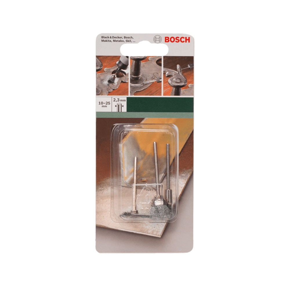 Bosch ecsetkefe készlet mini fúrógépekhez, 3 részes. Fém alkatrészek finom csiszolásához használható. A készlet tartalma: 1 db ecsetkefe, 1 db körkefe, 1 db gyűrűkefe.
