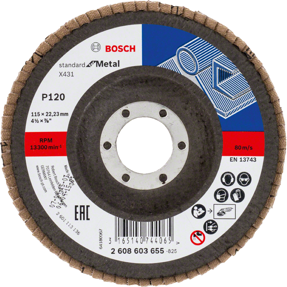 Bosch Standard for Metal legyező csiszolótárcsa 115 mm, 22,23 mm, G120. Az X431 Standard for Metal jó felületminőséget biztosít élek és hegesztési varratok lehordásához. Enyhén töredező alumínium-oxid szemcsekeveréke robusztus és kopásálló, ami egyenletes felületminőséget biztosít. Erős hordozóanyaga keresztszövésű: stabilitást biztosít a tiszta és egyenletes felülethez. A szemcséket a nehéz munkákhoz szükséges kopásállóság érdekében műgyanta kötőanyagba ágyazzák. Az X431 Standard for Metal felszerelhető sarokcsiszolókra.