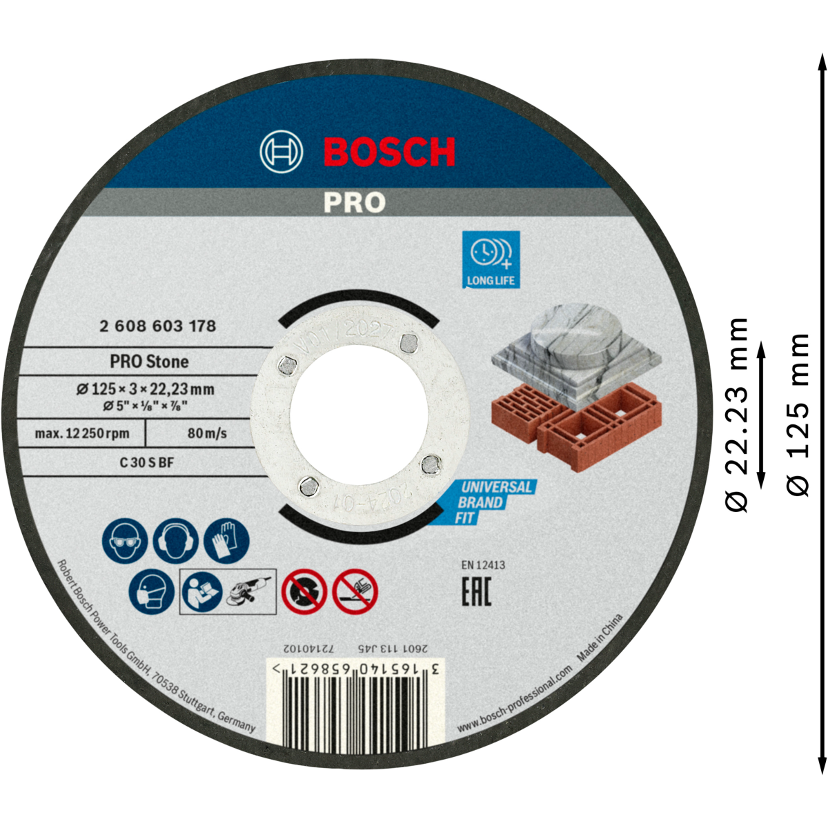 Darabolótárcsa, egyenes, Standard for Stone C 30 S BF, 125 mm, 22,23 mm, 3,0 mm. A Standard for Stone vágótárcsa megbízható teljesítményt nyújt beton megmunkálása esetén. Jó minőségű, gyantába ágyazott szilícium-karbid tárcsa, kifejezetten betonvágáshoz. A Bosch vágótárcsák a szigorúbb biztonsági követelményeknek is megfelelnek, teljesítik például az EN 12413 előírásait. 22,23 mm-es furattal normál rögzítőanyás sarokcsiszolókhoz.