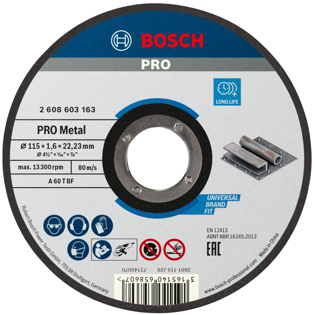 A Bosch Standard for Metal vágótárcsa megbízható teljesítményt nyújt fémek, többek közt acél, öntöttvas és nemvasfémek megmunkálása esetén. A tárcsa általános fémvágáshoz használható alumínium-oxidból készül. Rendkívül hosszú élettartamú. Gyors és tiszta vágásokat ejt, sorjaképződés vagy kékes elszíneződés nélkül. Tárcsaátmérő: 115 mm. Furatátmérő: 22.23 mm. Vastagság: 1.6 mm.