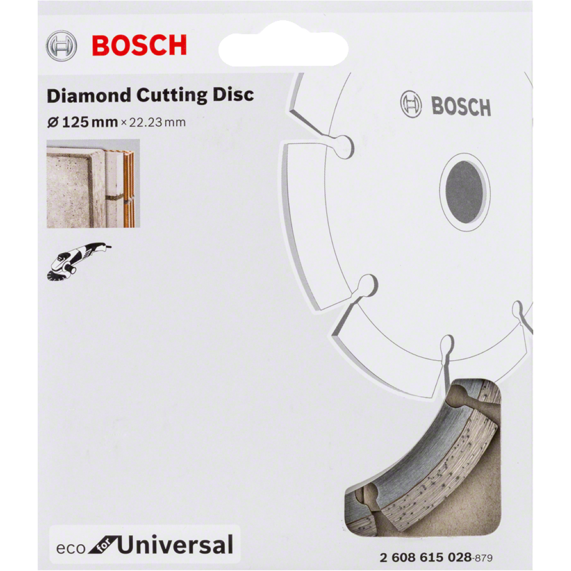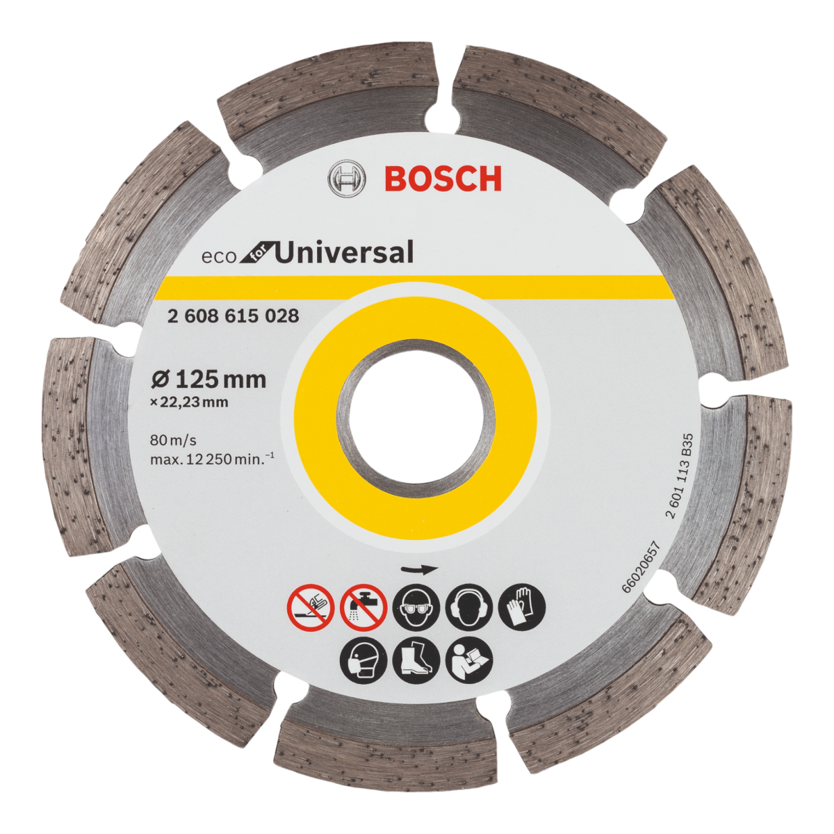 Bosch ECO For Universal gyémánt darabolótárcsa 125 mm x 22.23 mm x 2.0 mm x 7mm. A szinterezett vágószegmensek számos anyag vágására alkalmasak. Használható betonhoz, téglához, mészkőhöz és tetőcseréphez. X-LOCK sarokcsiszolóhoz és 22,23 mm-es szabványos sarokcsiszolóhoz használható.