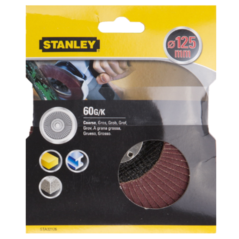 Stanley alumínium oxid szemcsés legyező csiszoló, használható fémre, fára, betonra. - átmérő: 125mm - szemcsefinomság: P60.