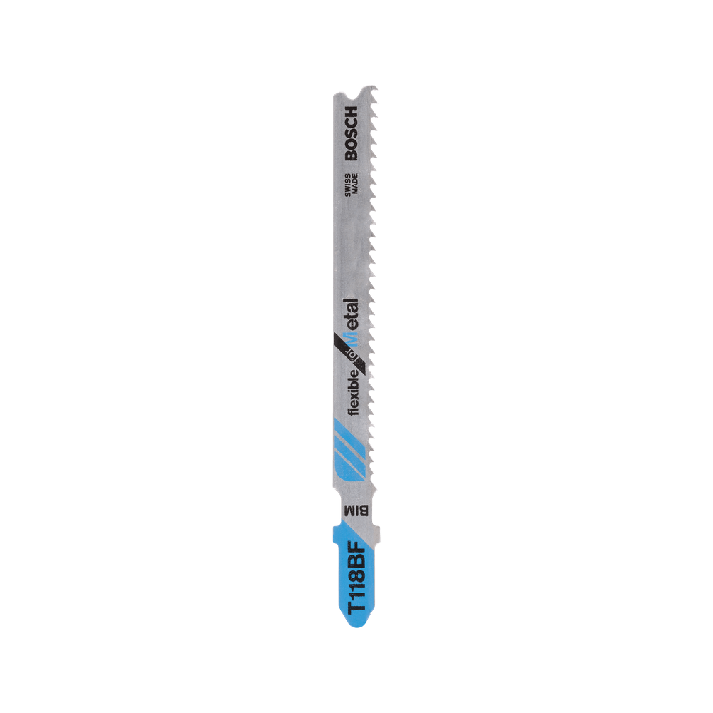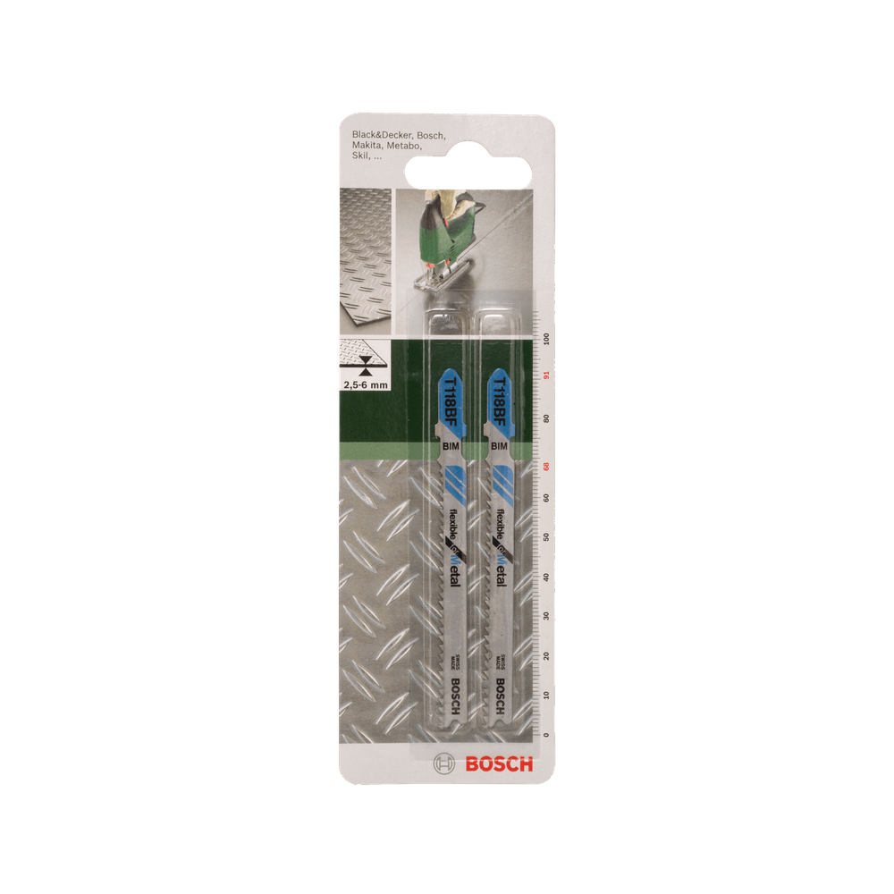 A Bosch T 118 BF dekopír fűrészlap fém anyagok egyenes vágására alkalmazható. Kiváló minőségű, bimetál anyaga alkalmassá teszi normál szilárdságú fémlemezek vágására. Hullámvonalban álló mart fogazata ideális különleges előírások nélküli vágásokhoz. Minden T-befogószárú szúrófűrészhez használható. Teljes hossza 91 mm. Fogosztása 1.9-2.3 mm. Ajánlott max. anyagvastagság 6 mm.