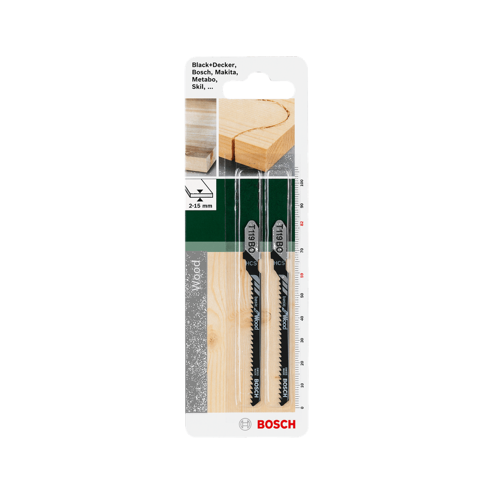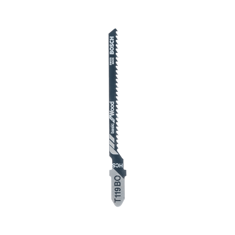 A Bosch T 119 BO Basic for Wood szúrófűrészlap fa anyagok ívelt vágására alkalmas. Magas széntartalmú acélból készül, hullámvonalban álló mart fogazása ideális különleges előírások nélküli vágásokhoz puhafába és rétegelt lemezben. Minden T-befogószárú szúrófűrészhez használható. Teljes hossza 82 mm. Fogosztása 2 mm. Ajánlott max. anyagvastagság 15 mm.