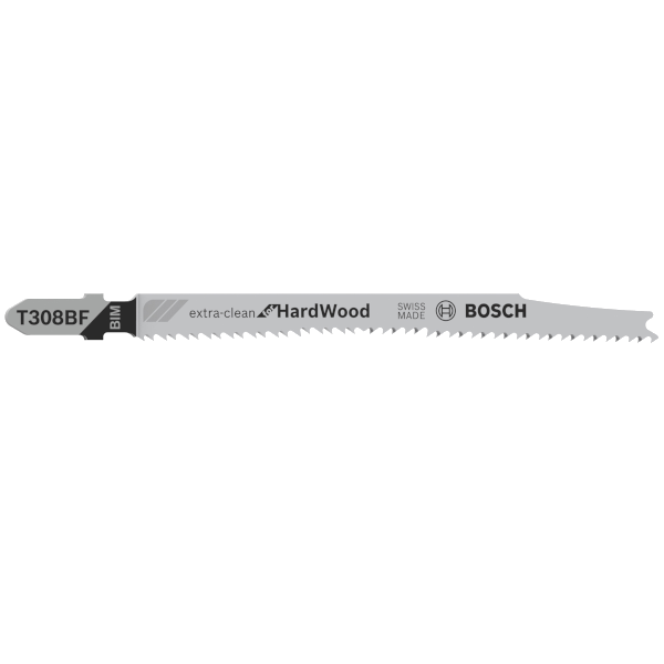 3 db-os fűrészlap szett, T 308 BF BIM. Szúrófűrészekhez. A T 308 BF Extra-Clean for Hard Wood szúrófűrészlap fa különlegesen tiszta, egyenes vágására alkalmas. Precíziósan köszörült fogazata és kúposra csiszolt lapja miatt tiszta vágásra alkalmas. Két sorban, különböző szögben elhelyezett fogazata szálkásodás mentes vágást biztosít a felső és alsó felületen. Minden T befogószárú szúrófűrészhez használható.