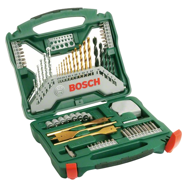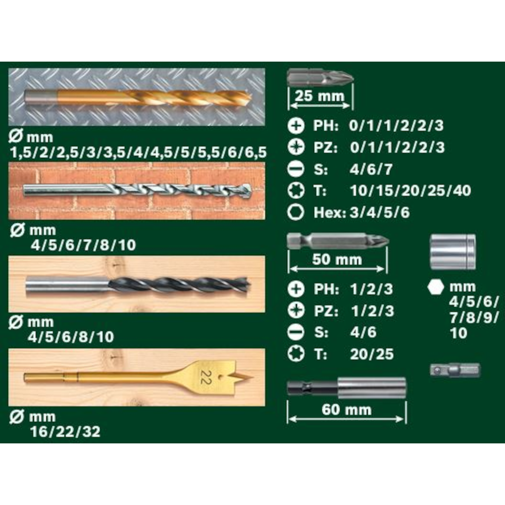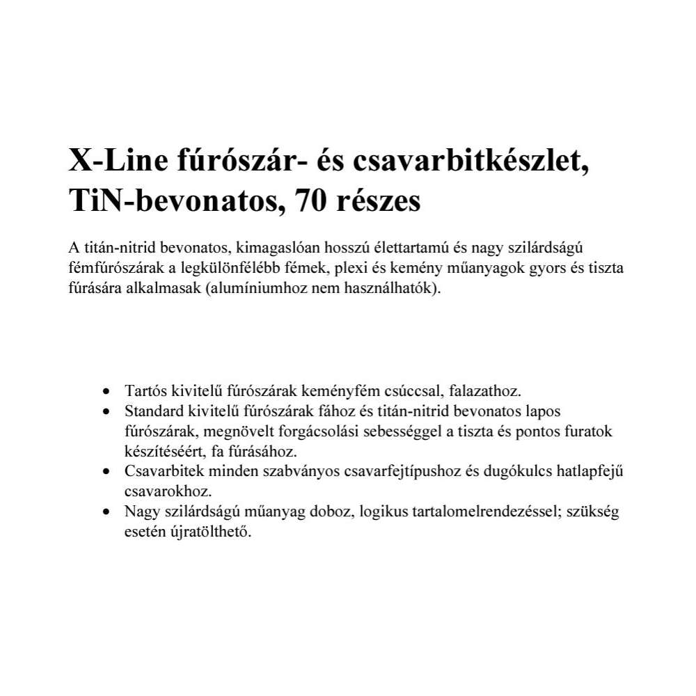 70 részes X-Line fúrószár- és csavarbitkészlet, TiN-bevonatos. A titán-nitrid bevonatos, kimagaslóan hosszú élettartamú és nagy szilárdságú fémfúrószárak a legkülönfélébb fémek, plexi és kemény műanyagok gyors és tiszta fúrására alkalmasak (alumíniumhoz nem használhatók). Tartós kivitelű fúrószárak keményfém csúccsal, falazathoz. Standard kivitelű fúrószárak fához és titán-nitrid bevonatos lapos fúrószárak, megnövelt forgácsolási sebességgel a tiszta és pontos furatok készítéséért, fa fúrásához. Csavarbitek minden szabványos csavarfejtípushoz és dugókulcs hatlapfejű csavarokhoz. Nagy szilárdságú műanyag doboz, logikus tartalomelrendezéssel; szükség esetén újratölthető.