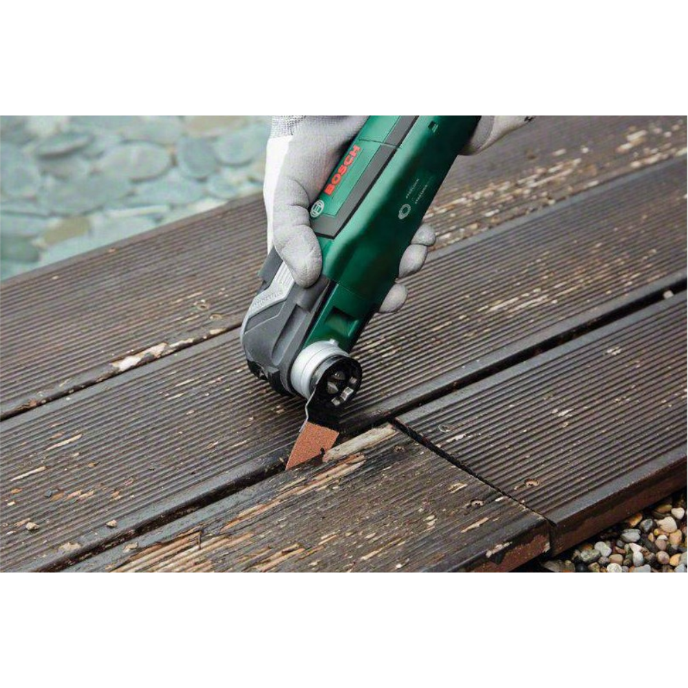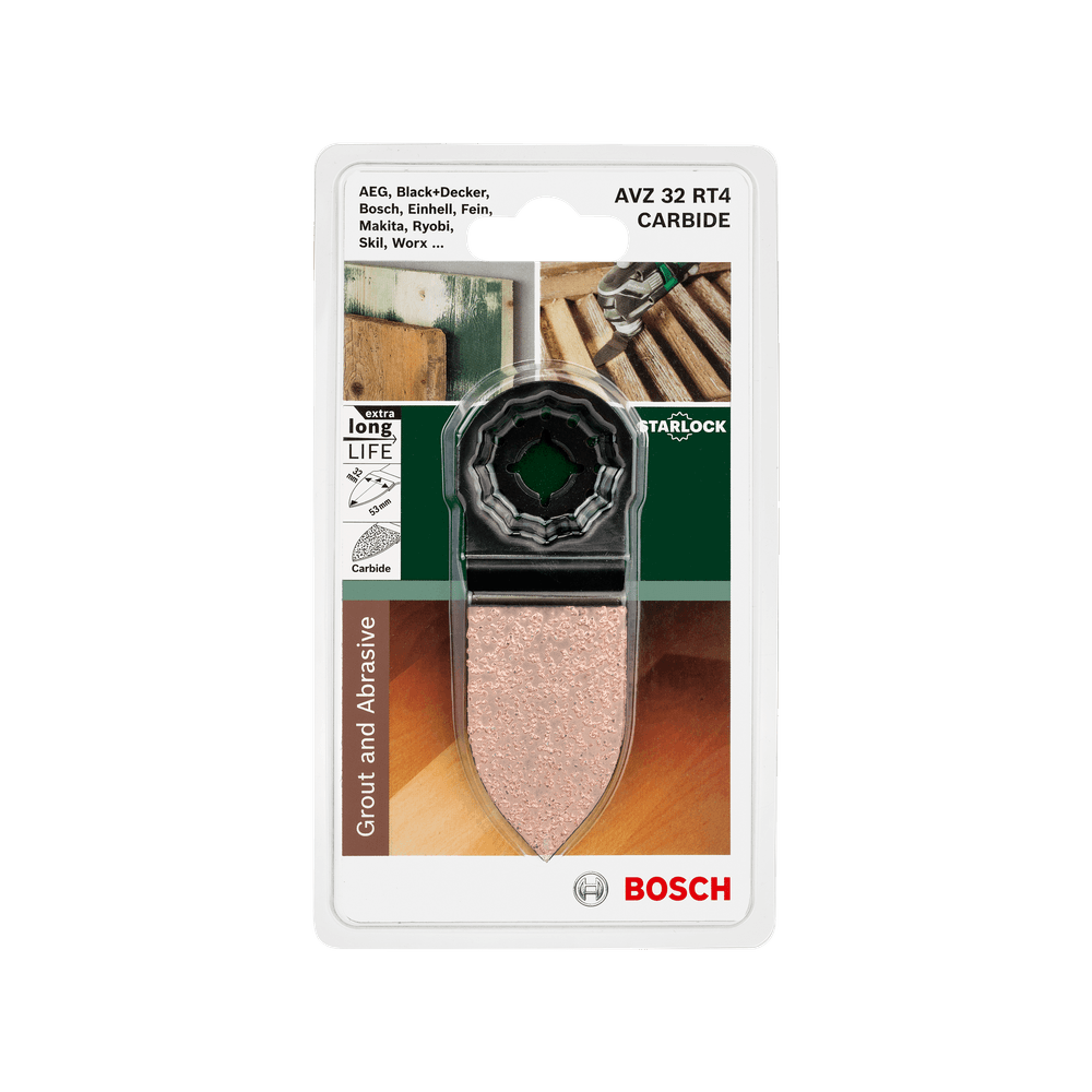 Bosch AVZ 32 RT4 csiszolólap multifunkciós rezgőfűrészekhez. Keményfémszemcsés csiszolólap fa, fa-műanyag kompozit és epoxigyanta csiszolásához. A lap segítségével a nehezen elérhető helyeken, pl. zsalugáterekben is könnyű a felület csiszolása. Eltömődésgátló technológiája megóvja a csiszolólapot és hosszú élettartamot biztosít. Starlock rögzítőrendszer a nagy erőátvitelhez. A legtöbb márka szabványos multifunkciós rezgőfűrészére felszerelhető.
