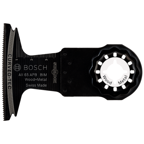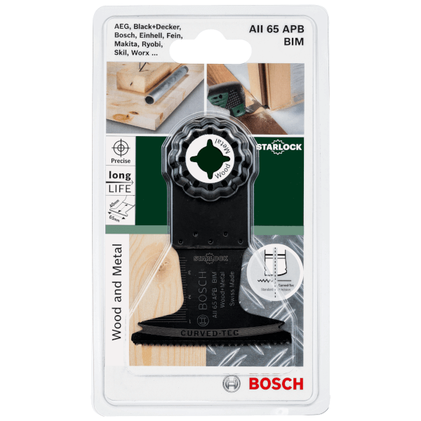 Bosch AII 65 APB merülőfűrészlap multifunkciós rezgőfűrészekhez. Bimetál fogakkal a hosszan tartó teljesítményért. Süllyesztett középrész merülővágáshoz. Használható szögelt fában merülővágásra, valamint laminált panelekhez, pl. ajtókeret hosszra vágásakor vagy a polclap bemélyedéseihez. Starlock rögzítőrendszer a nagy erőátvitelhez. A legtöbb márka szabványos multifunkciós rezgőfűrészére felszerelhető.