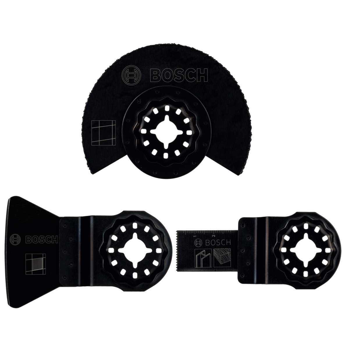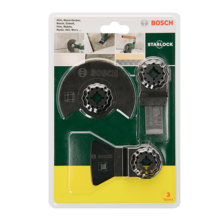 Bosch Tiles 3 részes csempéző készlet multifunkciós rezgőfűrészekhez. A készlet tartalma: 1 db ACZ 85 MT4 fűrészlap fuga eltávolításához és betonba történő kivágások készítéséhez. 1 db AIZ 20 AB bimetál fűrészlap gipszkarton és rézcsövek vágásához. 1 db ATZ 52 SC magas széntartalmú (HCS) kaparó a csemperagasztó eltávolításához. A fűrészlapok a legtöbb márka szabványos multifunkciós rezgőfűrészére felszerelhető.
