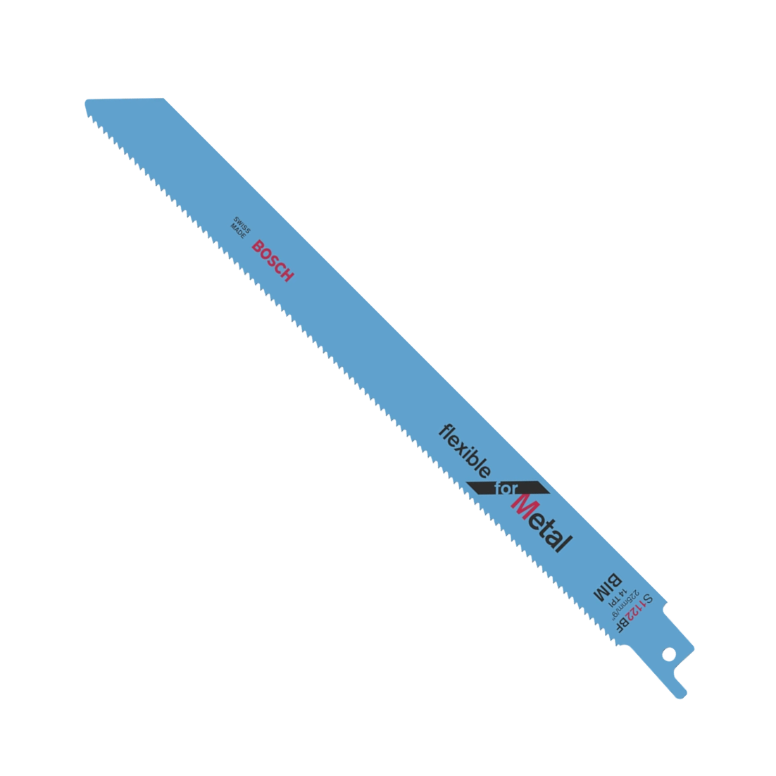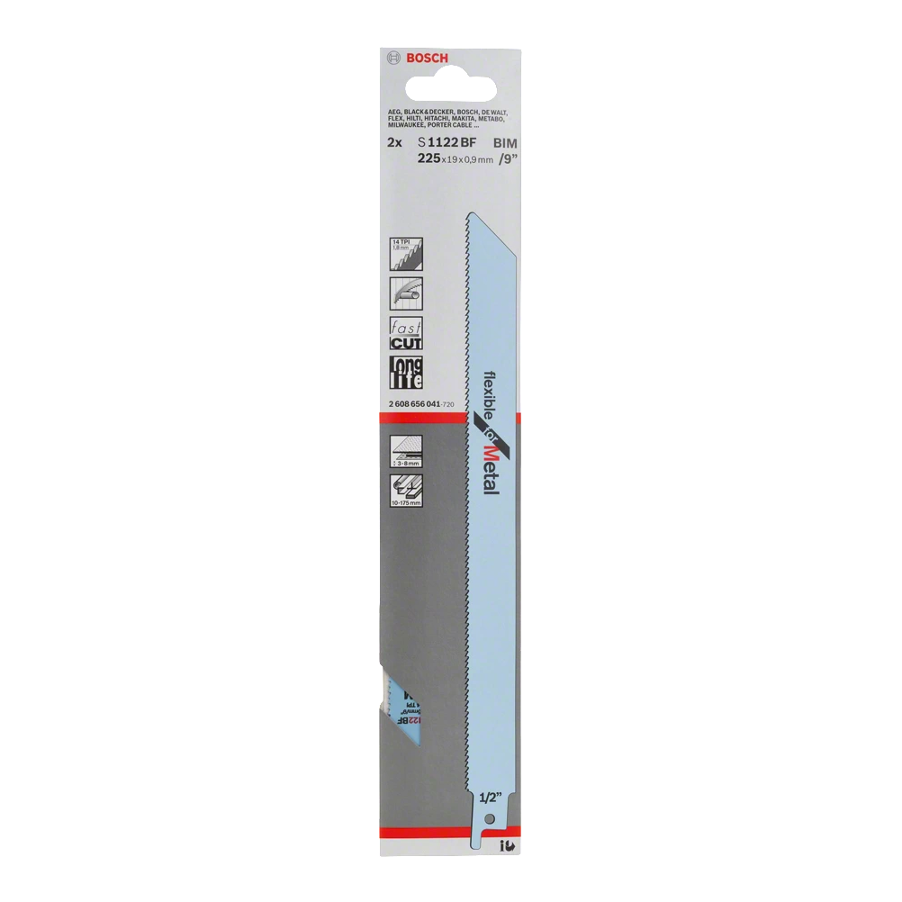 A Bosch S 1122 BF Flexible for Metal szablyafűrészlap fém anyagok merülővágására alkalmazható. Bimetál anyaga kiváló minőségű és nagy sebességű vágásra teszi alkalmassá acélban és nemvasfémekben. Minden S-befogószárú szablyafűrészhez használható. Teljes hossza 225 mm. Vastagsága 0.9 mm. Fogosztása 1.8 mm. Ajánlott max. vágásmélység 175 mm. Ajánlott max. anyagvastagság 8 mm. 2 db.