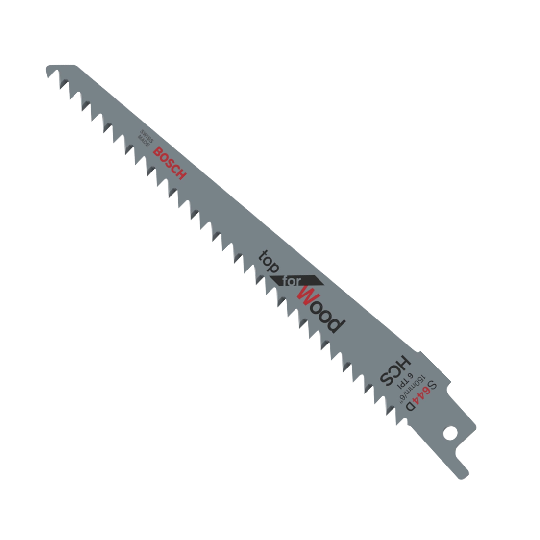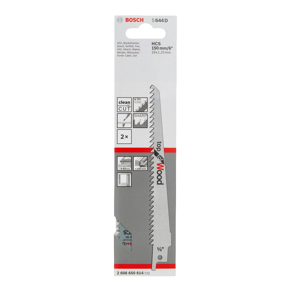 A Bosch S 644 D Top for Wood szablyafűrészlap tiszta, ívelt és beszúró vágásokra alkalmazható fa anyagokban. Magas széntartalmú acélból készül, élesre köszörült fogazata szálkásodásmentes vágást biztosít fában és szerkezeti faanyagokban. Kúpos kialakítása megkönnyíti a hozzáférést a nehezen elérhető helyeken és ívelt vágásra is lehetőséget biztosít. Csúcsa alkalmas beszúró vágásokra. Minden S-befogószárú szablyafűrészhez használható. Teljes hossza 150 mm. Vastagsága 1.25 mm. Fogosztása 4 mm. Max. vágásmélység 100 mm. 2 db.