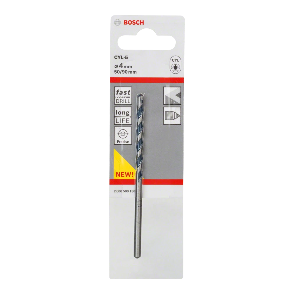Bosch CYL-5 betonfúrószár fúrógépekhez, ütvefúrókhoz. A CYL-5 fúrószár rendkívül hosszú élettartamot garantál rögzítőfuratok betonba és kőbe való fúrása során. Keményfém keverék anyaga és gyémántköszörülésű vágóéle kopásállóvá teszi a fúrószárat. 2 hornyos vario kivitele csökkenti a súrlódást, ami nagyszerű poreltávolítást biztosít és csökkentik a használatból eredendő kopást. Hengeres befogószára hárompofás fúrótokmányokkal kompatibilis. Átmérő: 4 mm. Munkahossz: 50 mm. Teljes hossz: 90 mm.