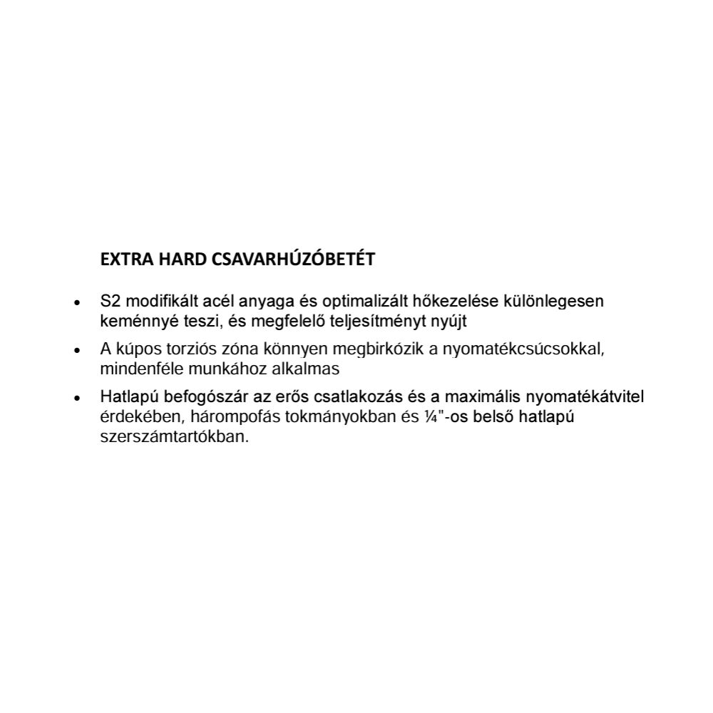 S2 modifikált acél anyaga és optimalizált hőkezelése különlegesen keménnyé teszi, és megfelelő teljesítményt nyújt. A kúpos torziós zóna könnyen megbirkózik a nyomatékcsúcsokkal, mindenféle munkához alkalmas. Hatlapú befogószár az erős csatlakozás és a maximális nyomatékátvitel érdekében, hárompofás tokmányokban és ¼"-os belső hatlapú szerszámtartókban. Igazán hasznos eszköz, így minden háztartásban elengedhetetlen.