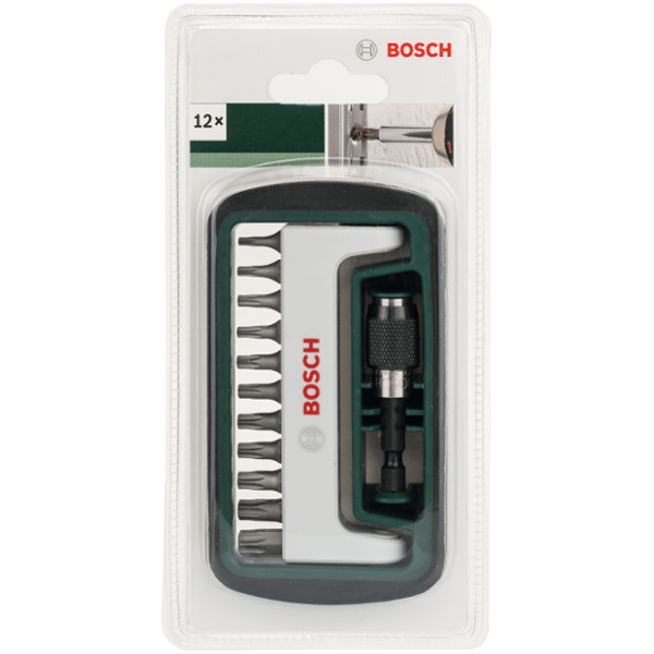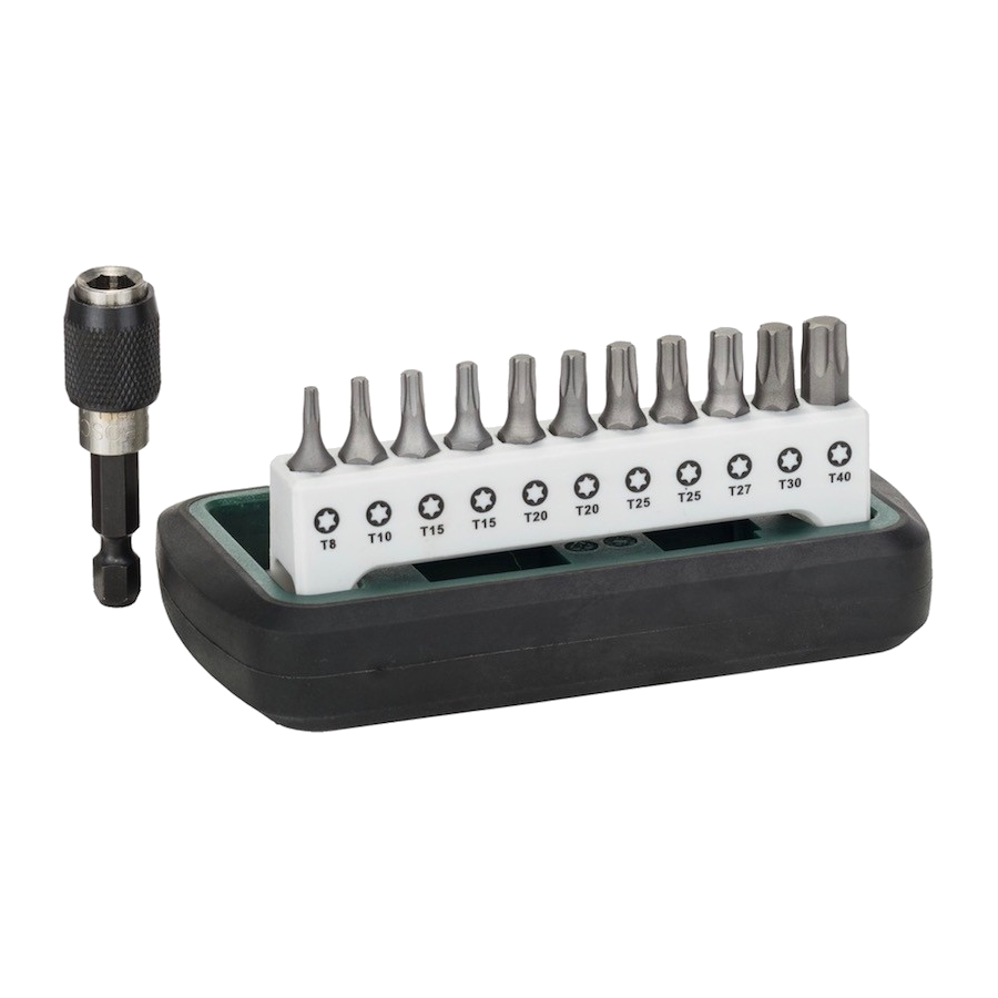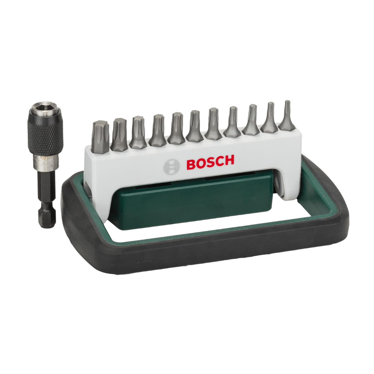 Bosch csavarozóbit készlet 11+1 részes. Egyszerű és megbízható csavarozás a Bosch normál minőségű csavarozóbitjeivel. Extra kemény fémből készült, hogy minden alkalmazásnál megállja a helyét. Torx csavarokhoz. Univerzális befogókban vagy közvetlenül IXO akkumulátoros csavarozógépben való használathoz. A készlet tartalma: T8, T10, 2 x T15, 2 x T20, 2 x T25, T27, T30, T40, 1 db mágneses univerzális bittartó.
