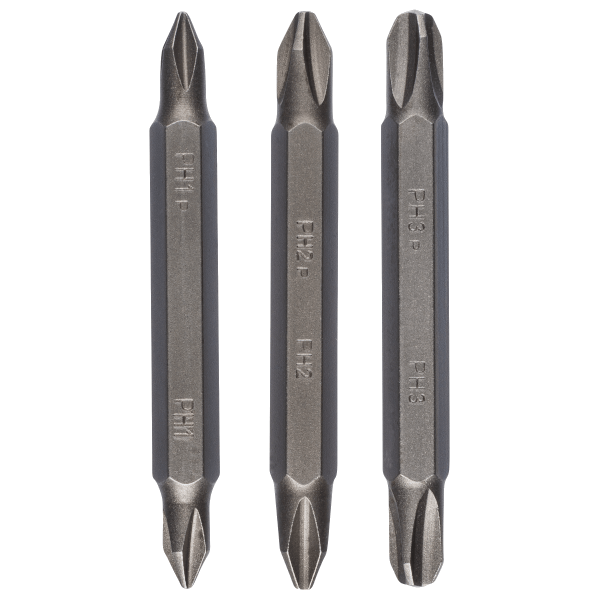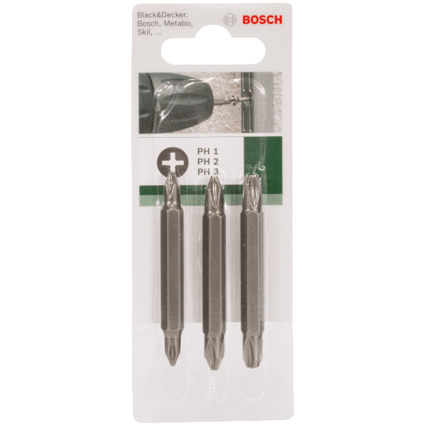 Bosch kétvégű csavarozóbit készlet. Egyszerű és megbízható csavarozás a Bosch normál minőségű csavarozóbitjeivel. Extra kemény fémből készült, hogy minden alkalmazásnál megállja a helyét. Philipps kereszthornyú csavarokhoz. Fúrótokmányokban való közvetlen használathoz. Tartalma: PH 1 / 2 / 3.
