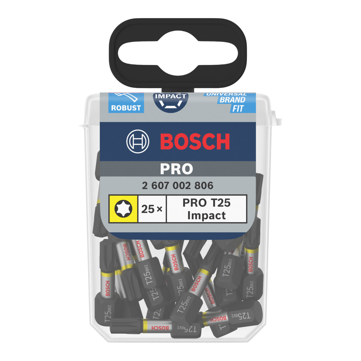 T25 25 mm-es csavarozóbit 25 db/csomag kiszerelésben. Az Impact Control csavarbit nagy szilárdságú, mely csavarhúzókkal és ütvecsavarozókkal is használható. Meghosszabbított torziós zónája miatt kivételesen tartós a hosszan tartó munkához. S2 módosított acél anyaga és az optimalizált hőkezelés különleges tartósságot biztosít, és nagy teljesítményre teszi képessé.